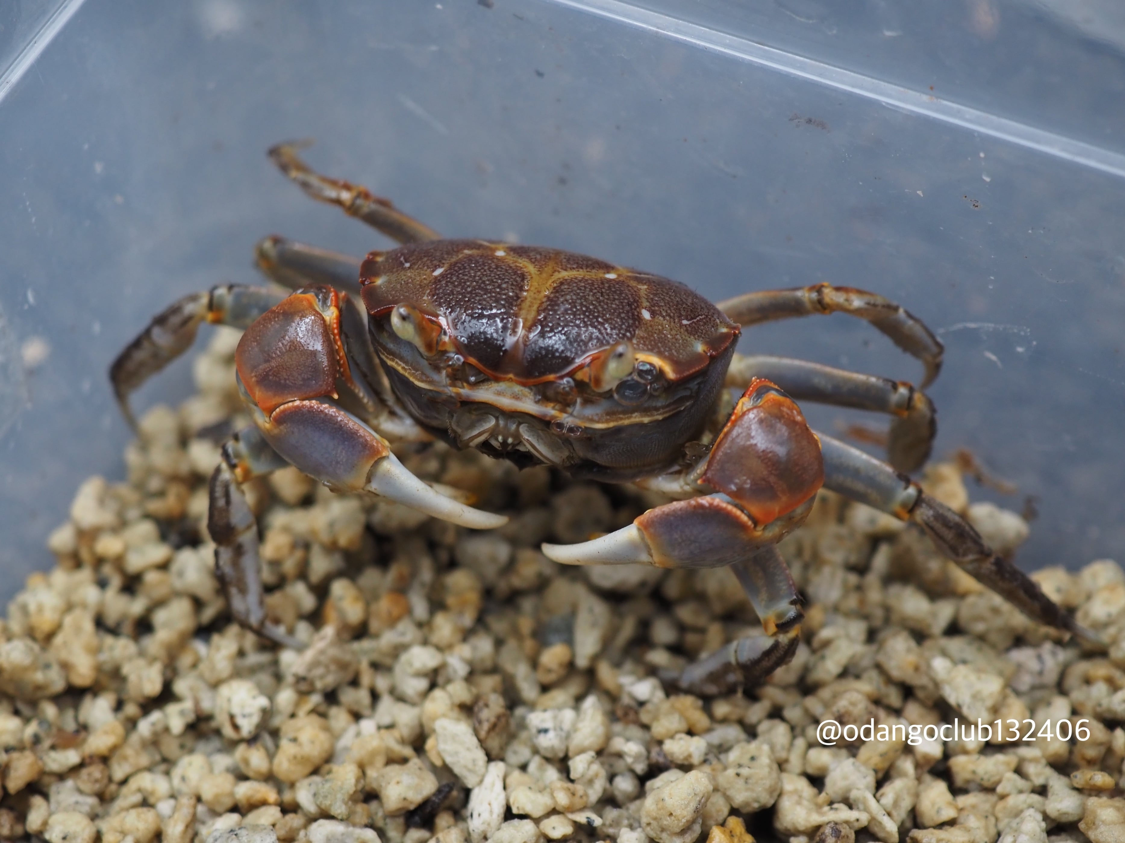 丸みを帯びた甲羅には縦にくっきりと溝が入るのが特徴的で、甲羅の周りを縁取るようにオレンジ色が入るのが美しいカニです。