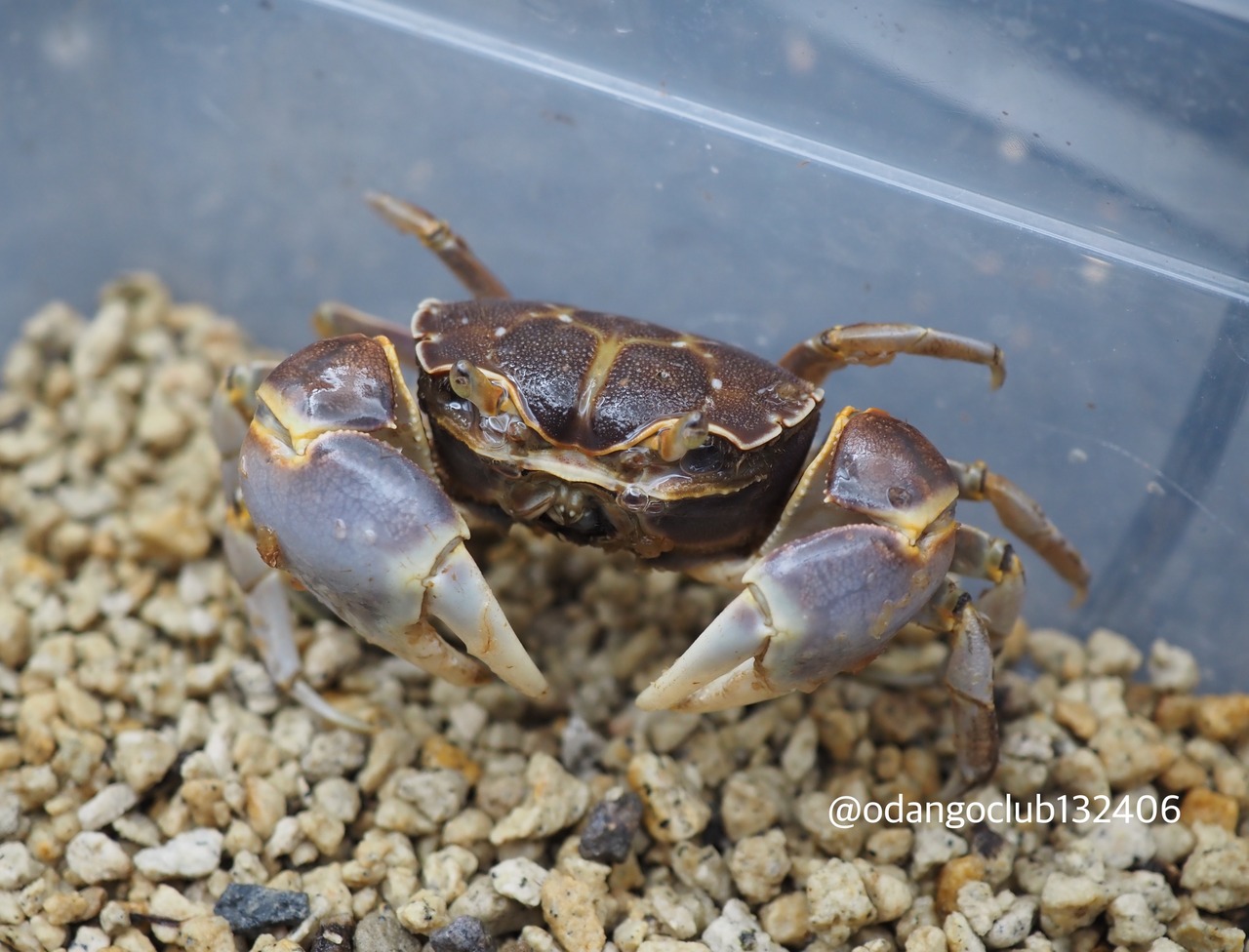丸みを帯びた甲羅には縦にくっきりと溝が入るのが特徴的で、甲羅の周りを縁取るようにオレンジ色が入るのが美しいカニです。