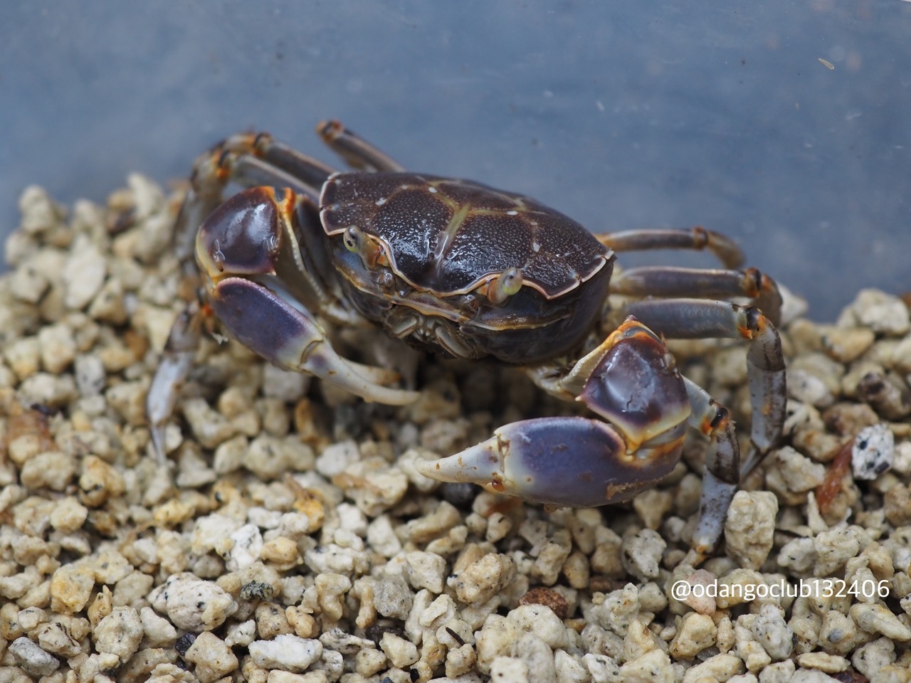 丸みを帯びた甲羅には縦にくっきりと溝が入るのが特徴的で、甲羅の周りを縁取るようにオレンジ色が入るのが美しいカニです。