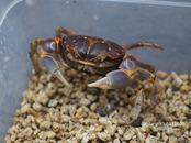丸みを帯びた甲羅には縦にくっきりと溝が入るのが特徴的で、甲羅の周りを縁取るようにオレンジ色が入るのが美しいカニです。