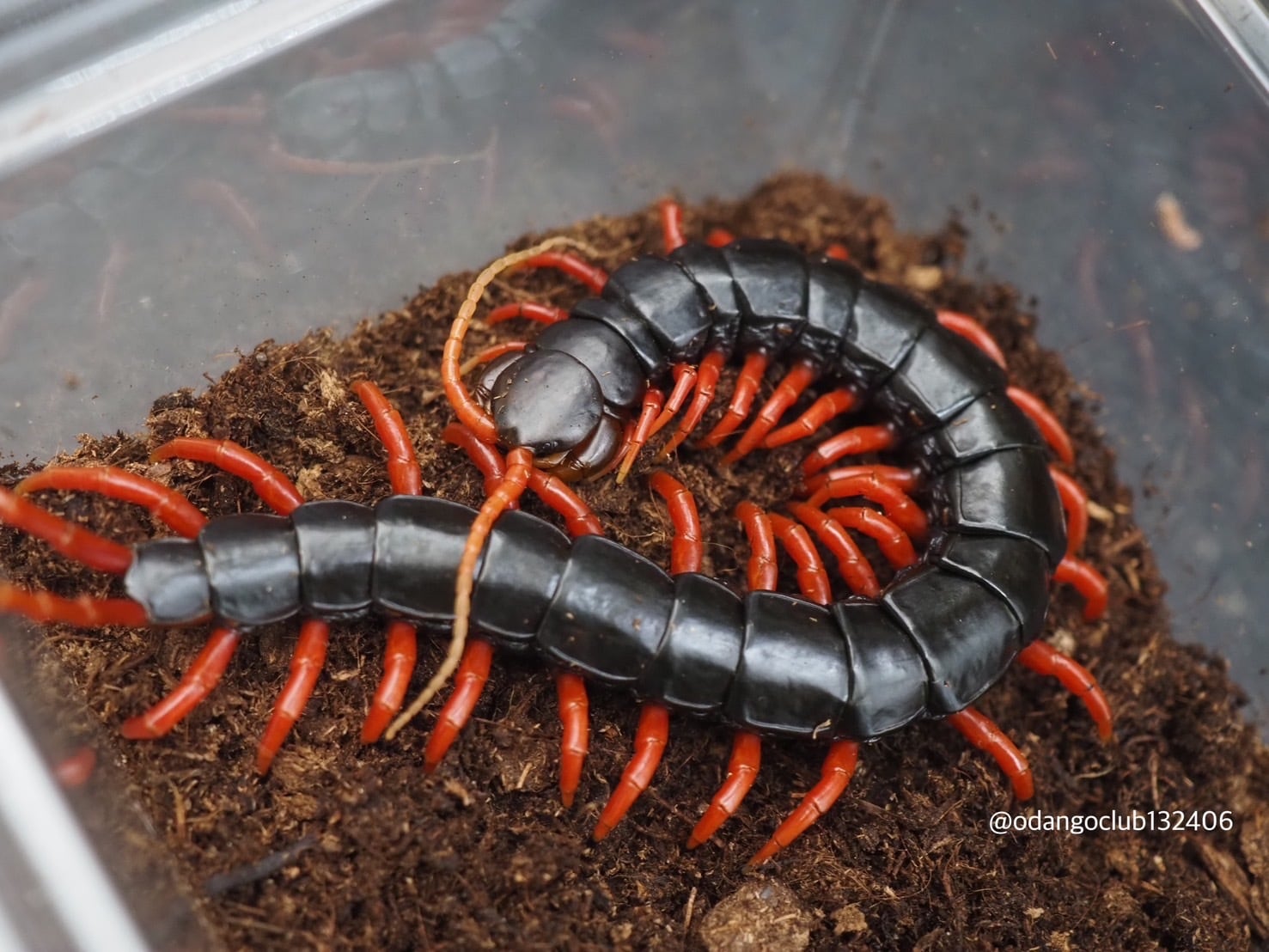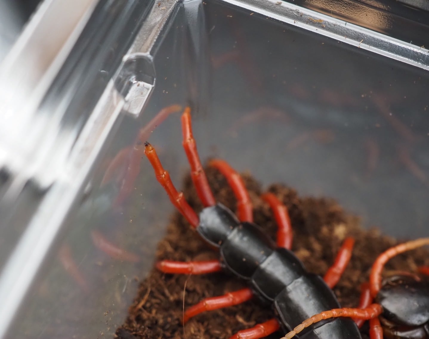 黒色の体にレッドレッグ、脚先には黄色が入る美しいムカデです。
