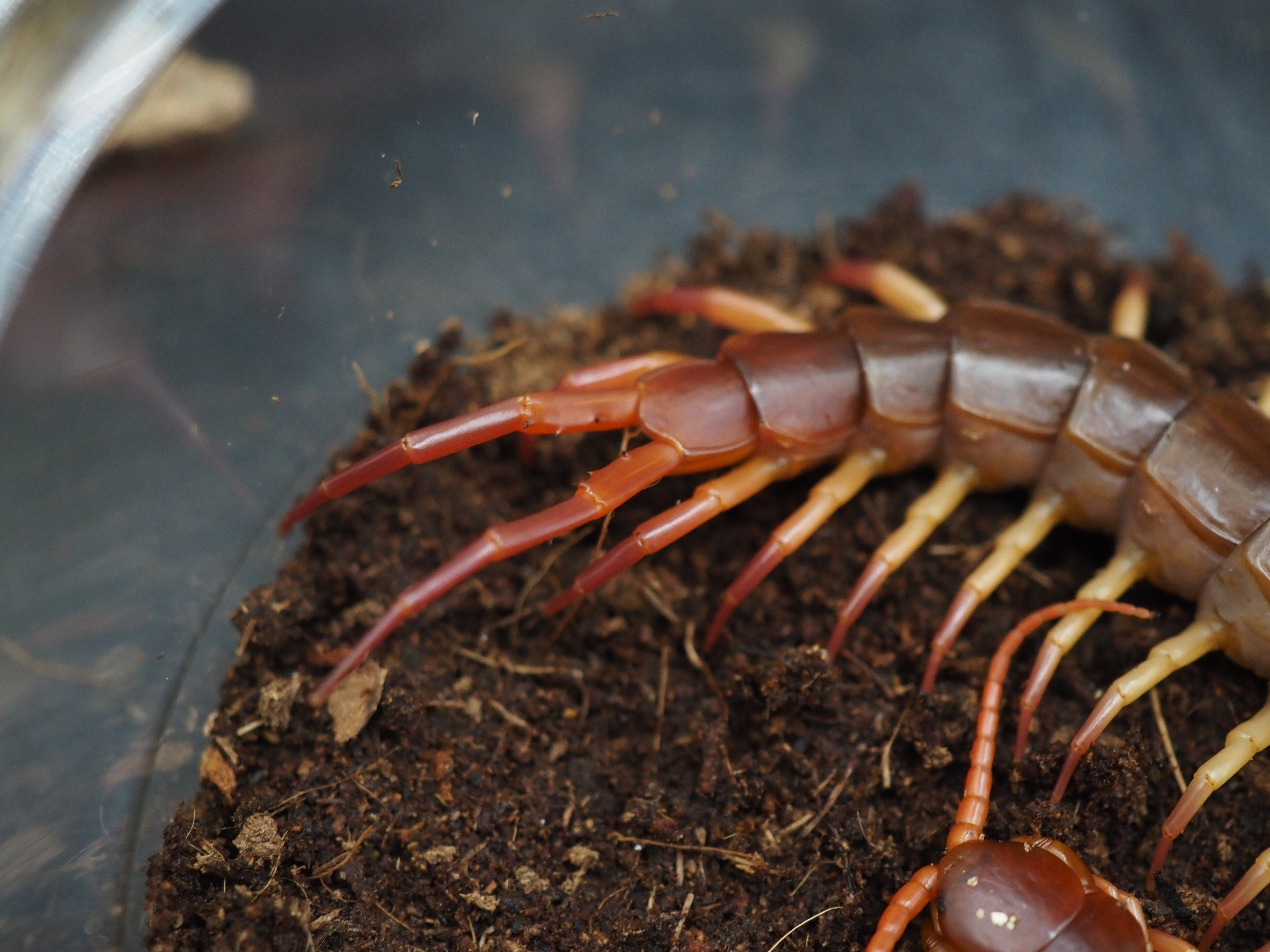 赤みを帯びた茶色の体にイエローレッグで足先が赤色になる非常に美しいムカデです。