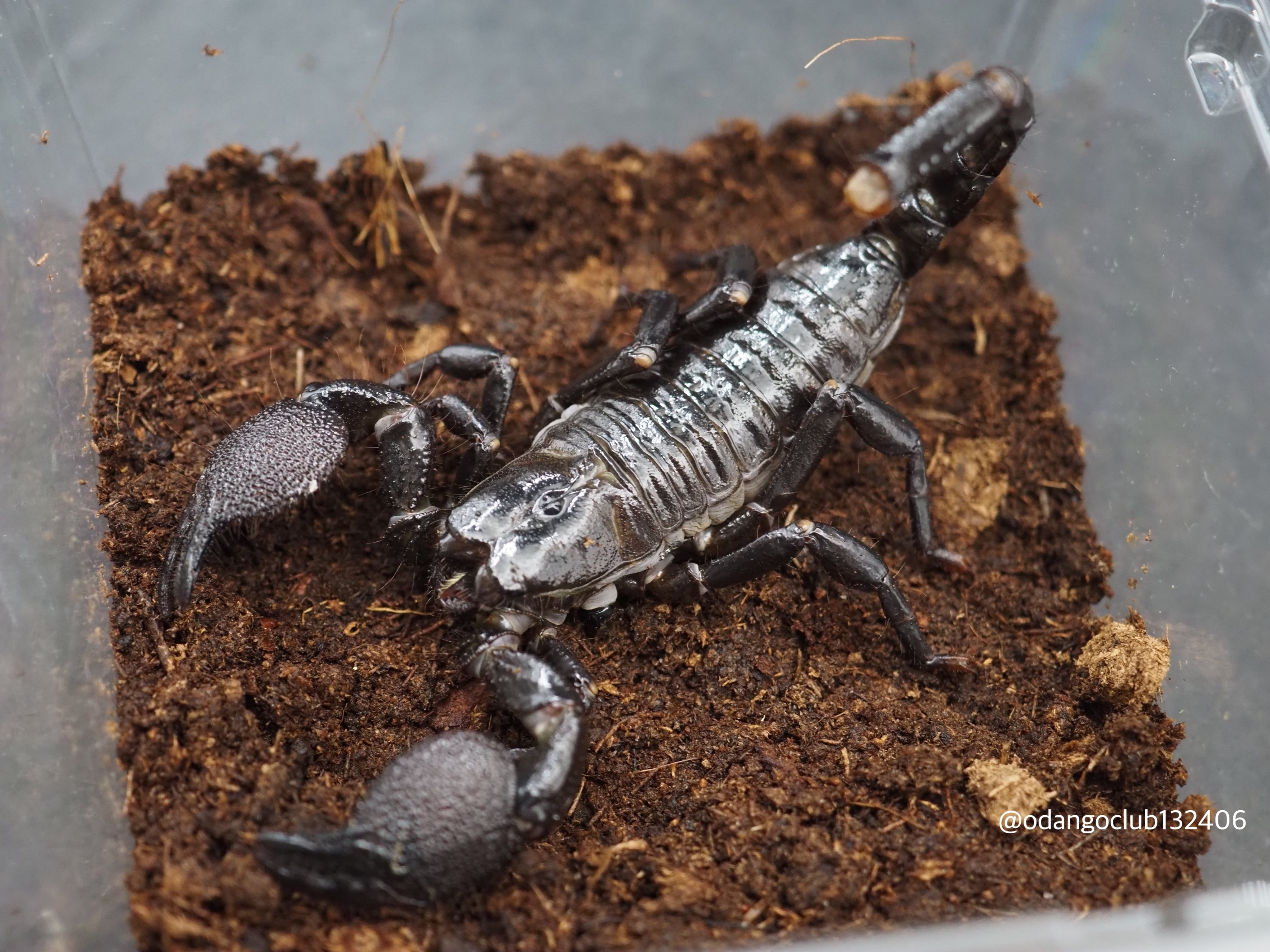 黒色の体に大きなハサミが格好良い世界最大級のサソリです。