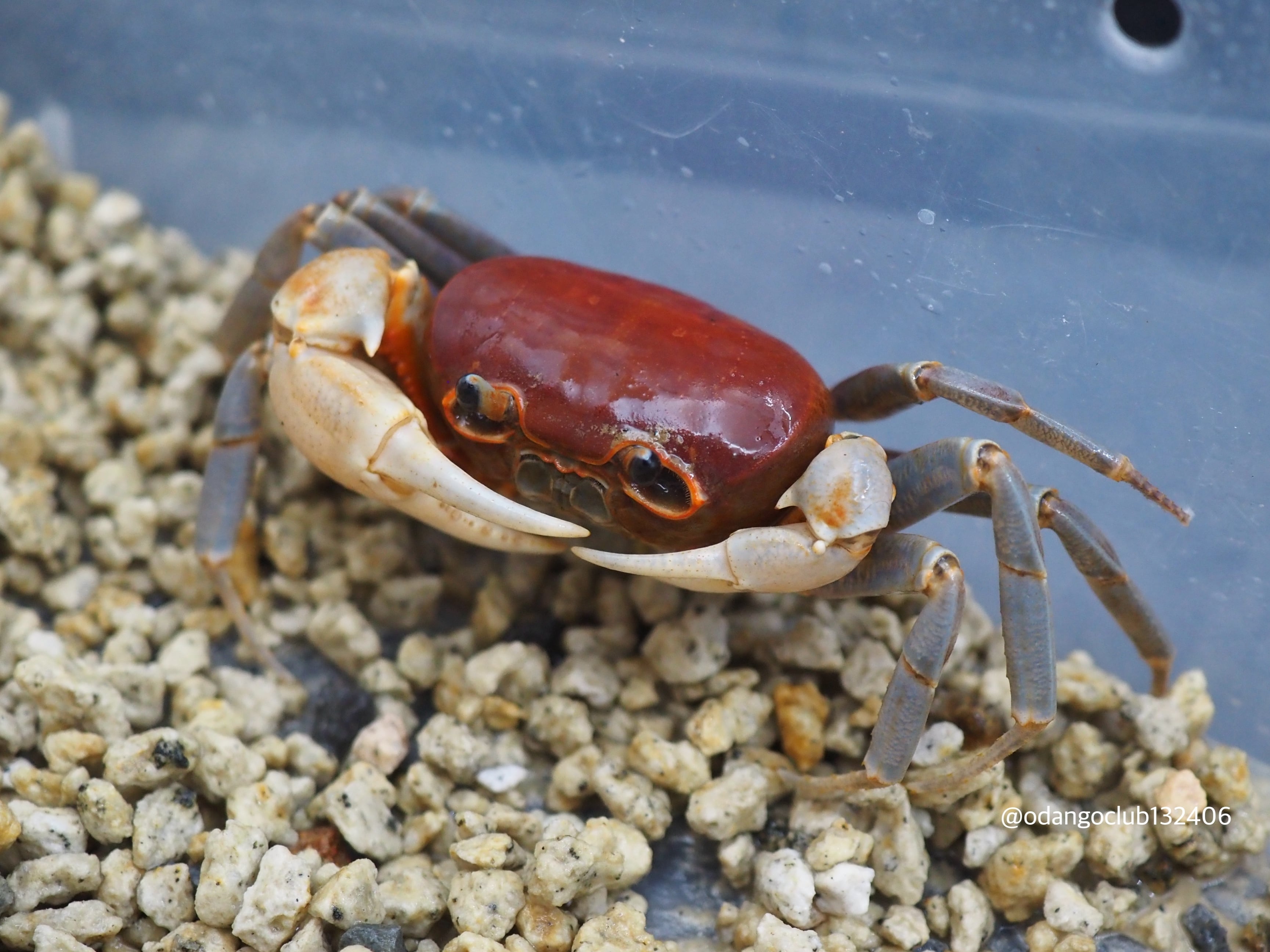オレンジ色の甲羅に白色のハサミと歩脚が美しいカニです。