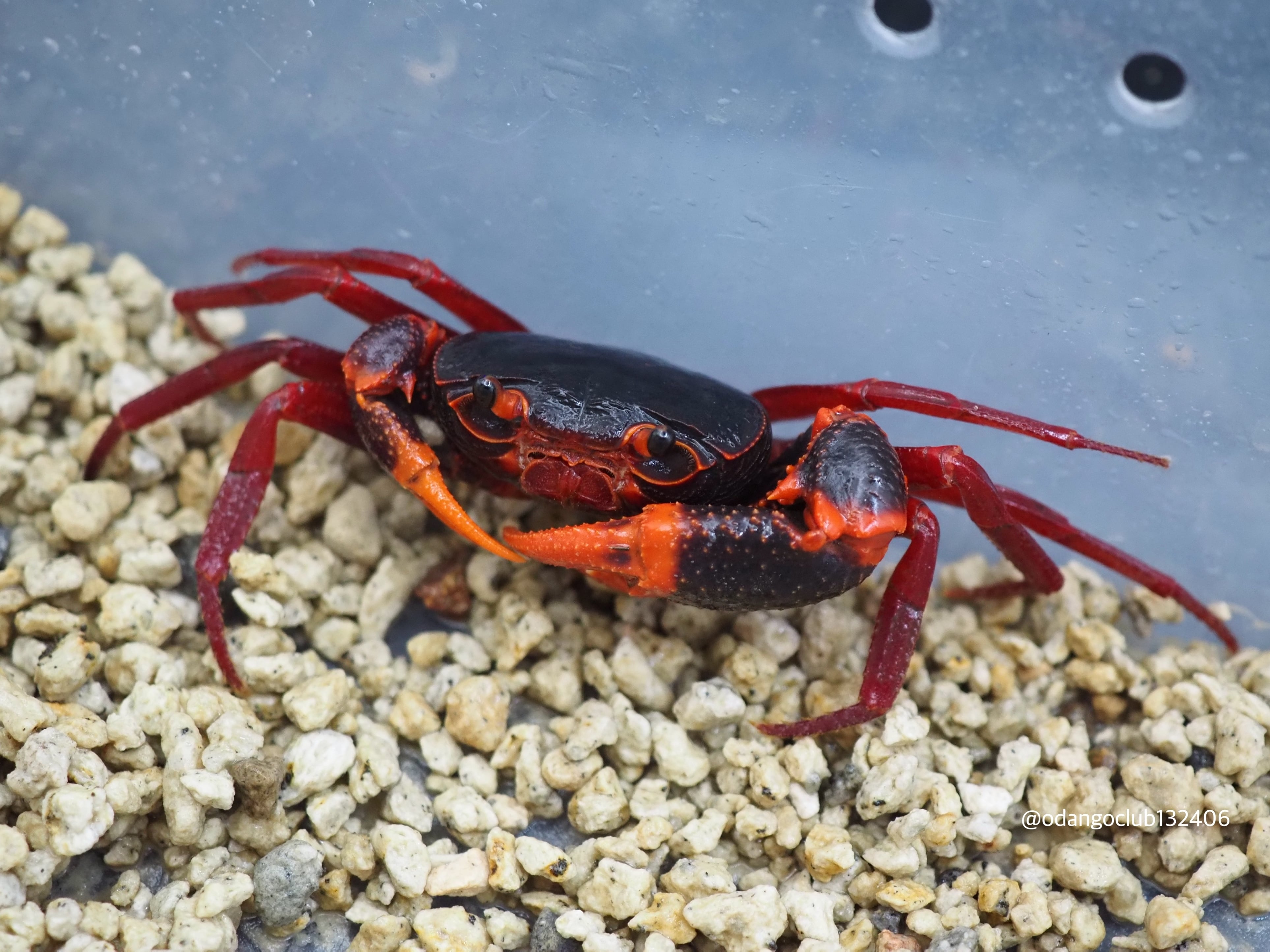 赤色と黒色の体でハサミの先端がオレンジ色の格好良いカニです。