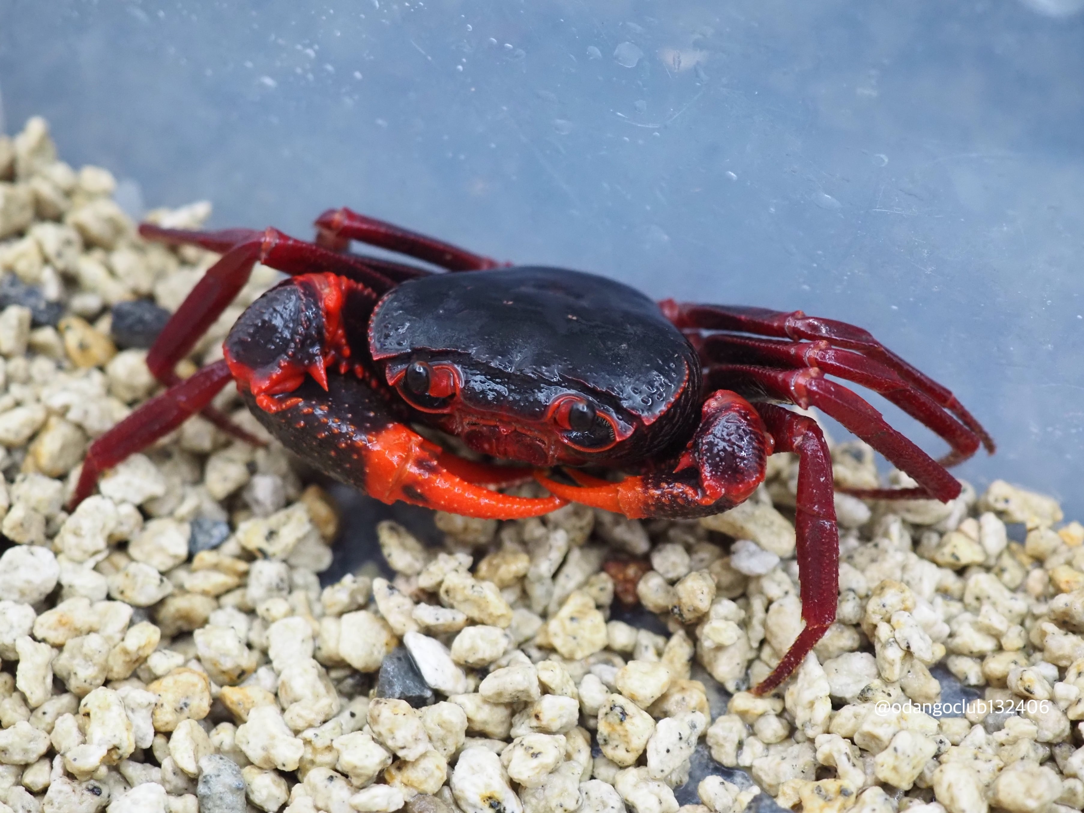 赤色と黒色の体でハサミの先端がオレンジ色の格好良いカニです。