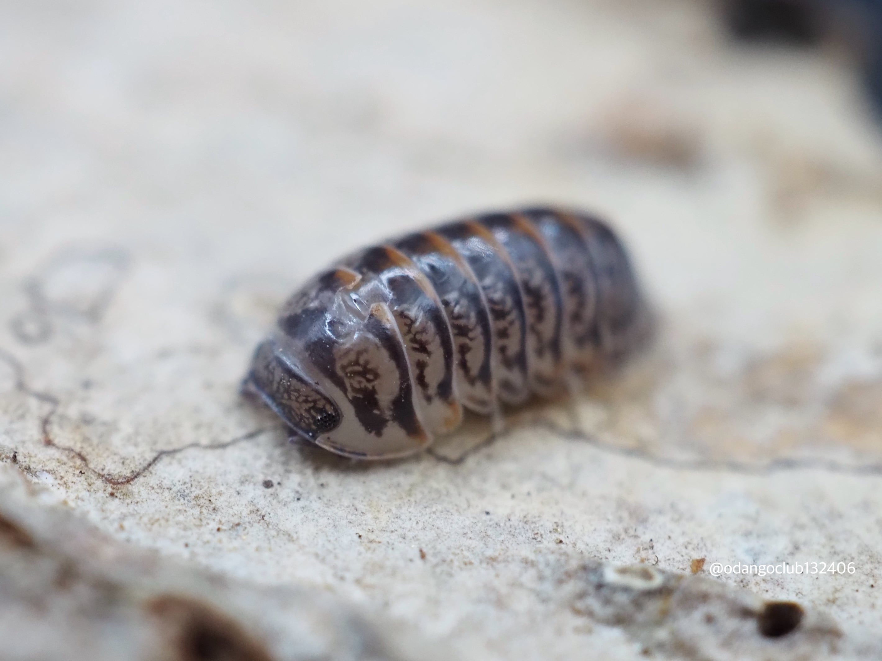 艶感のあるグレーの体に黒色の模様が入り、背中にオレンジ色が入る美しいダンゴムシです。