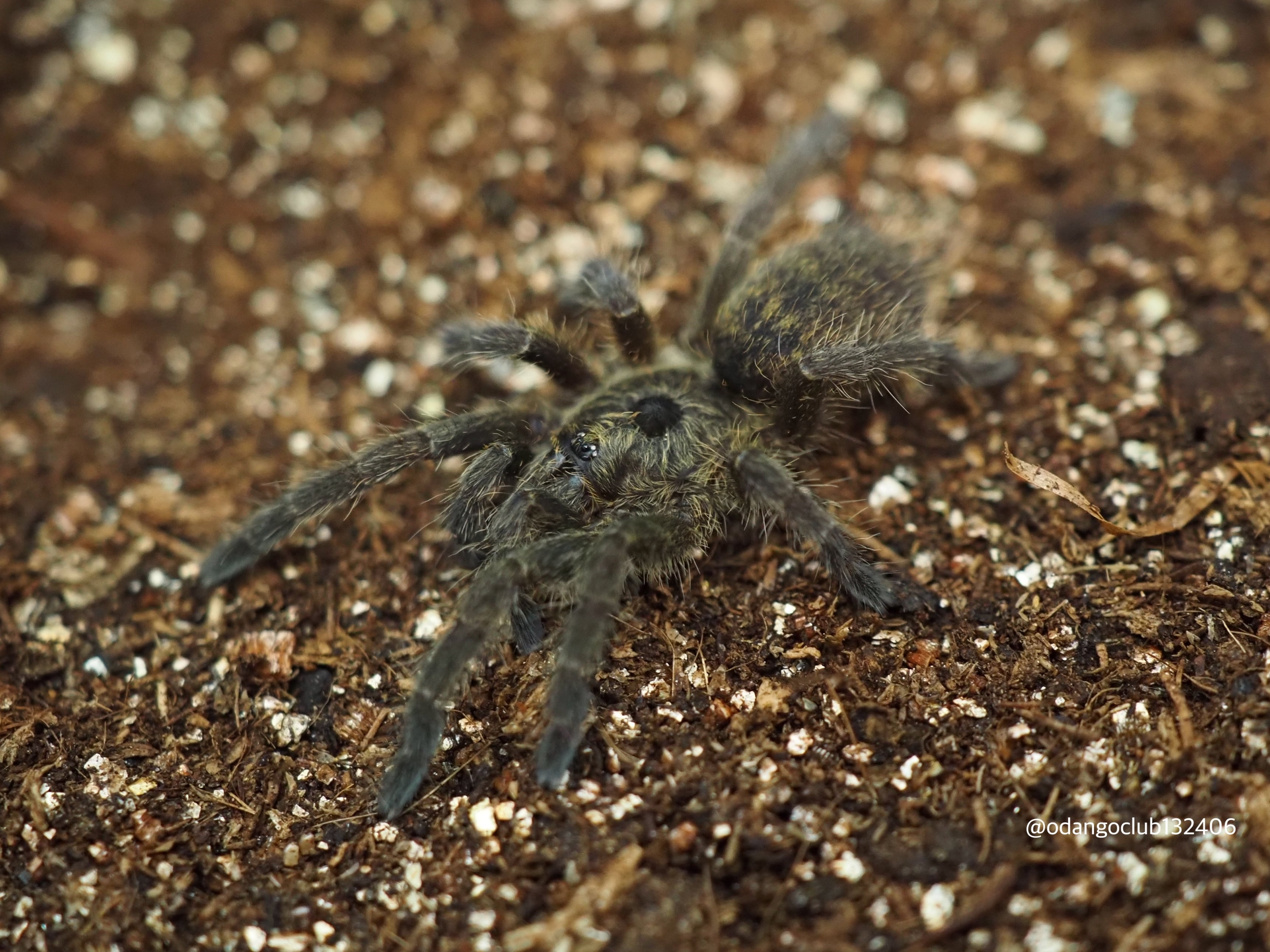 黄色味を帯びたグレーの体に角が生えるタランチュラになります。