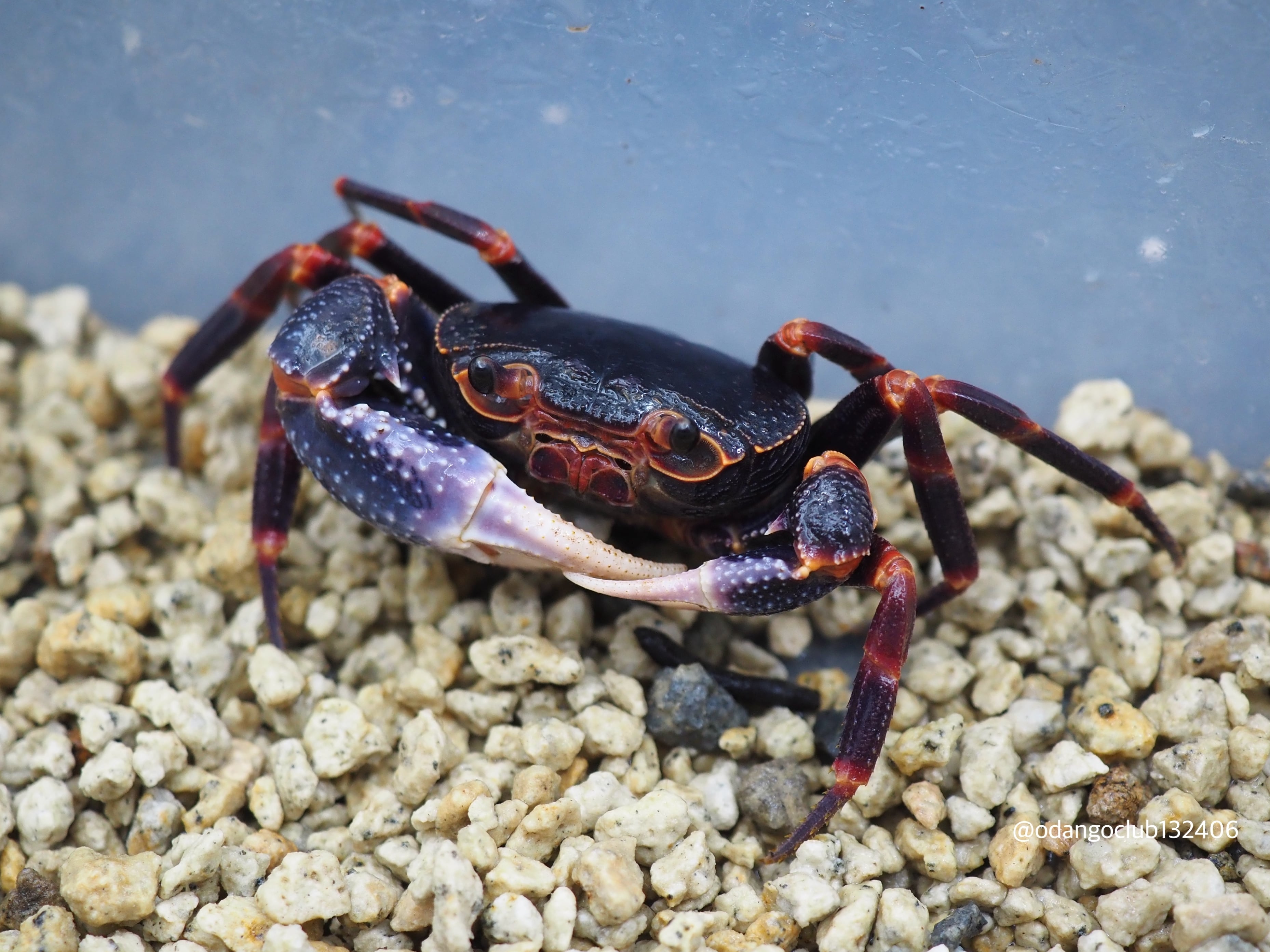 紫色の甲羅で歩脚の節とハサミの先にも紫色が入る美しいカニです。