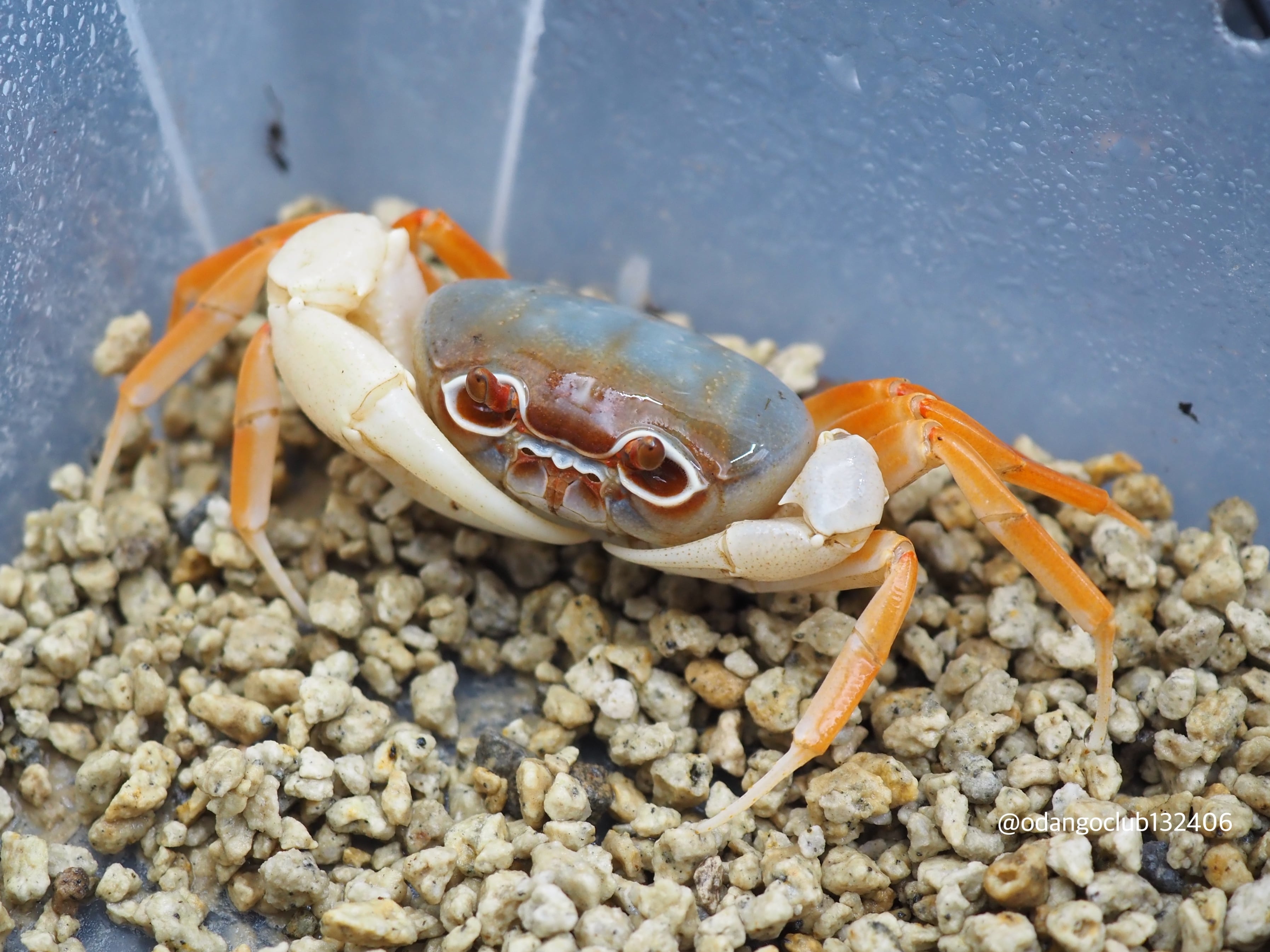 サーモンピンクの甲羅に白色ハサミが可愛いカニです。