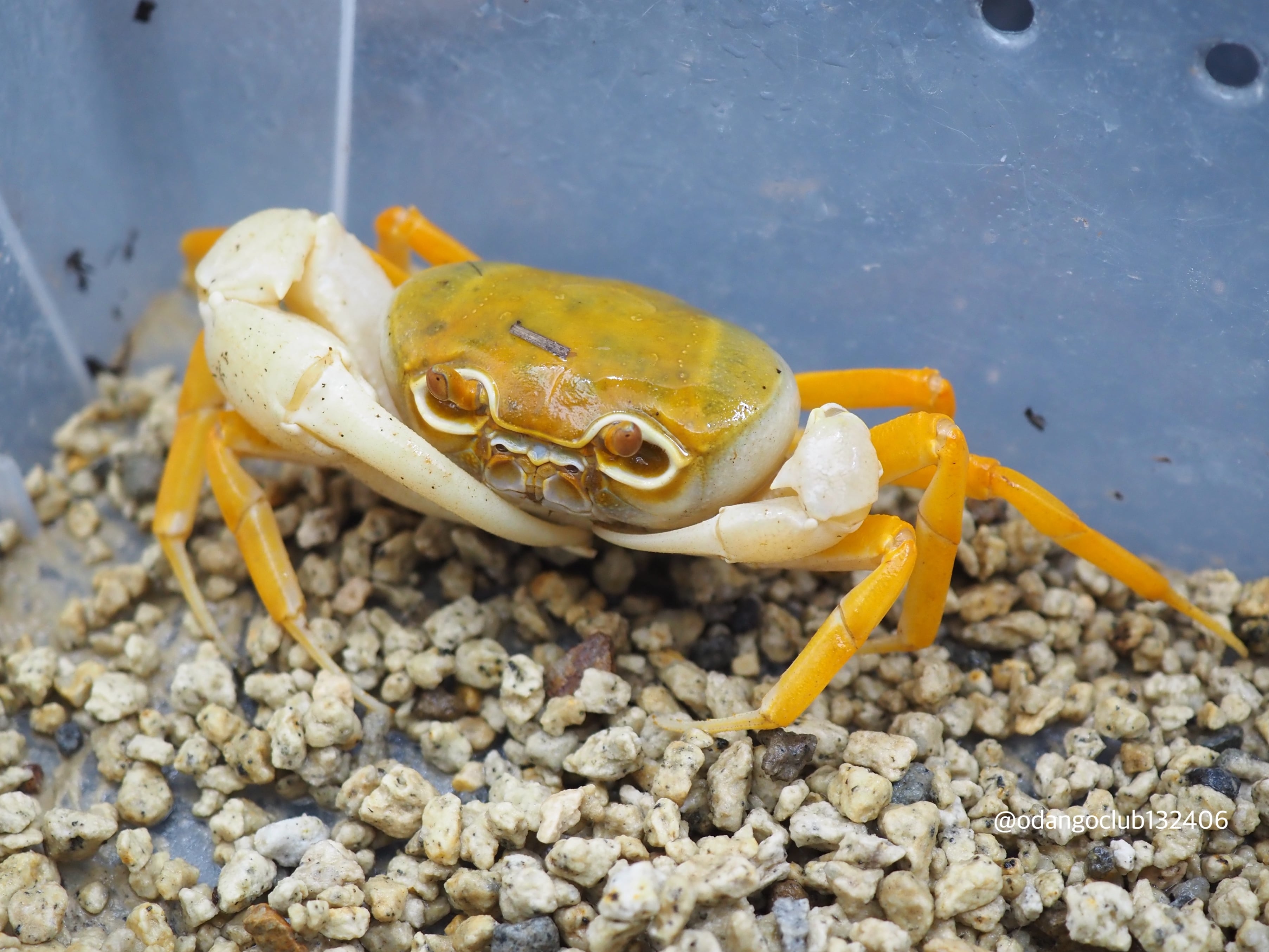 薄い黄色の甲羅に濃い黄色の歩脚、白色のハサミが美しいカニです。