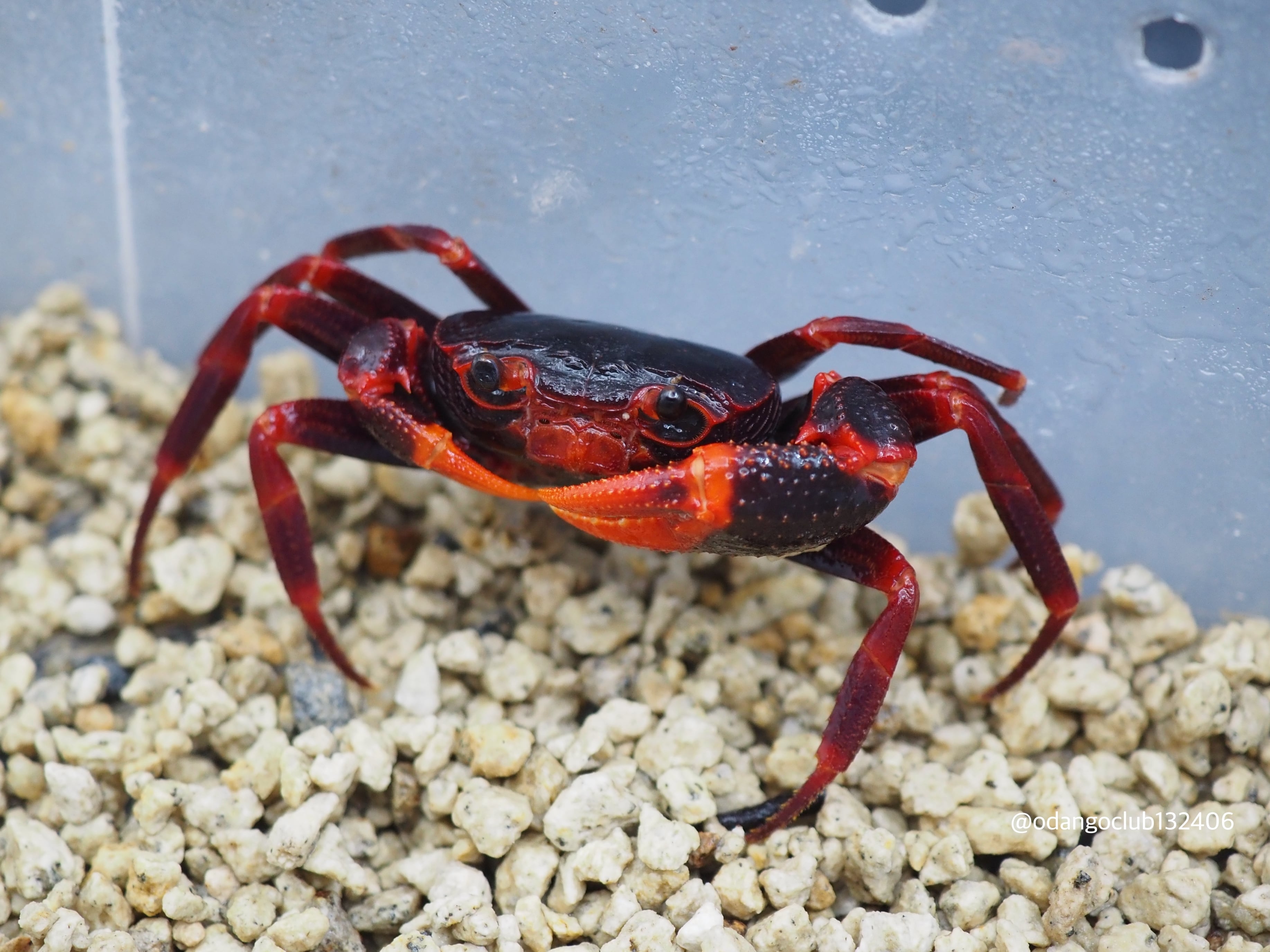 赤色と黒色の体でハサミの先端がオレンジ色の格好良いカニです。