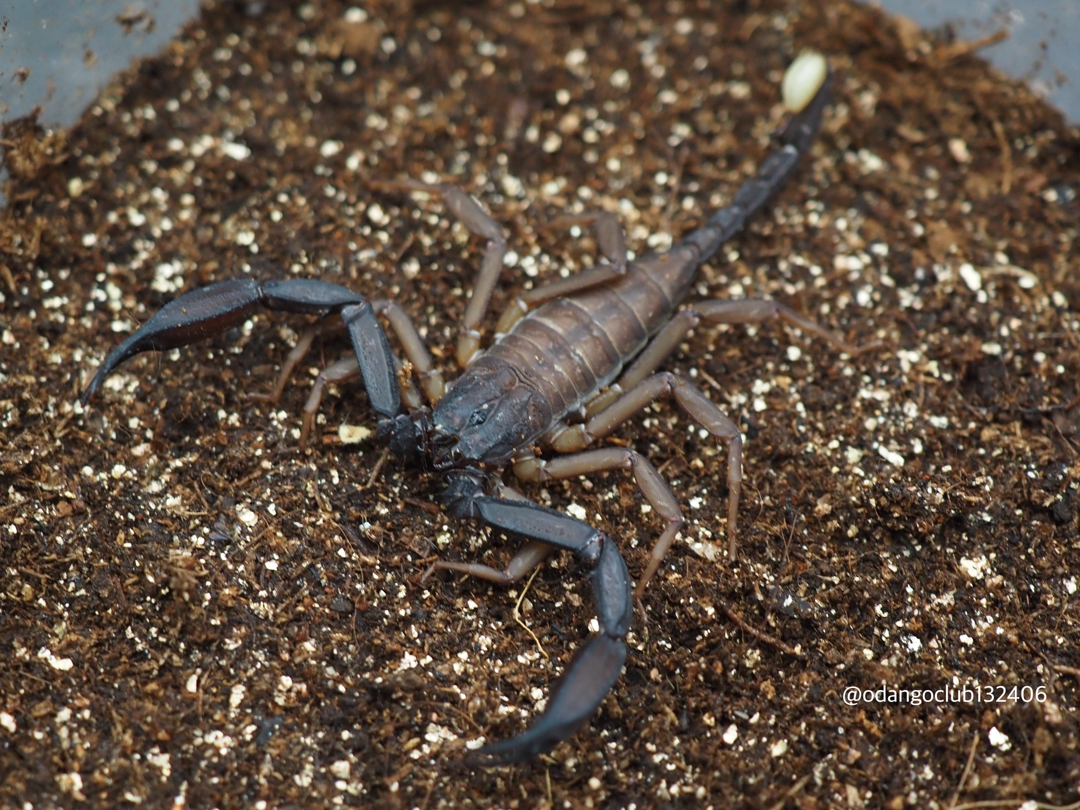 黒茶色の平べったい体にシャープな鋏が格好良く、黄色みを帯びた歩脚が美しいサソリです。