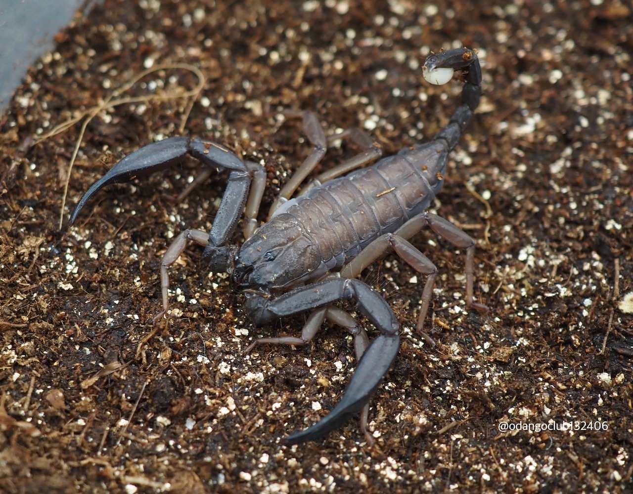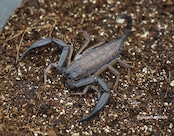 黒茶色の平べったい体にシャープな鋏が格好良く、黄色みを帯びた歩脚が美しいサソリです。