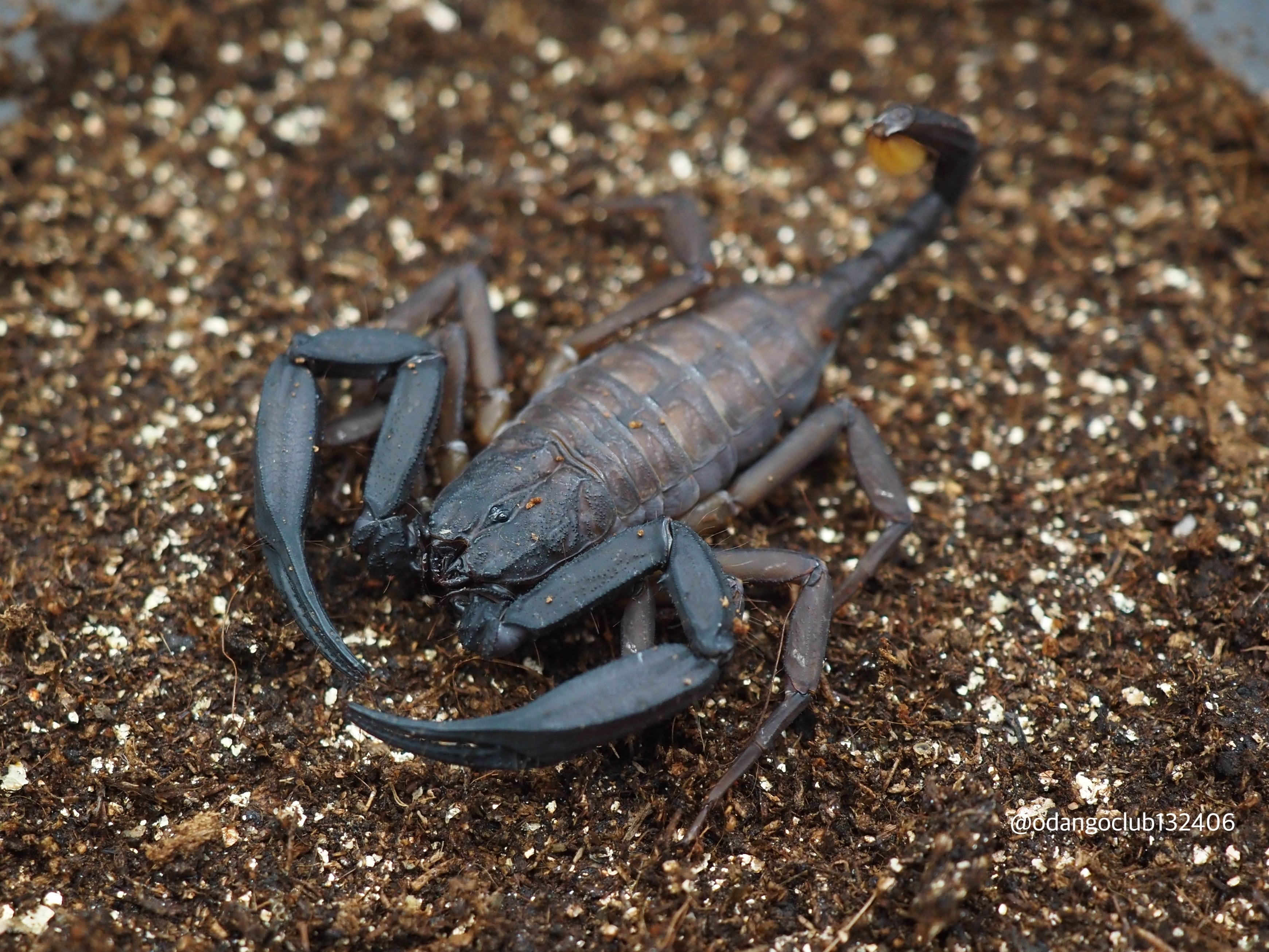 黒茶色の平べったい体にシャープなハサミが格好良く、黄色みを帯びた歩脚が美しいサソリです。