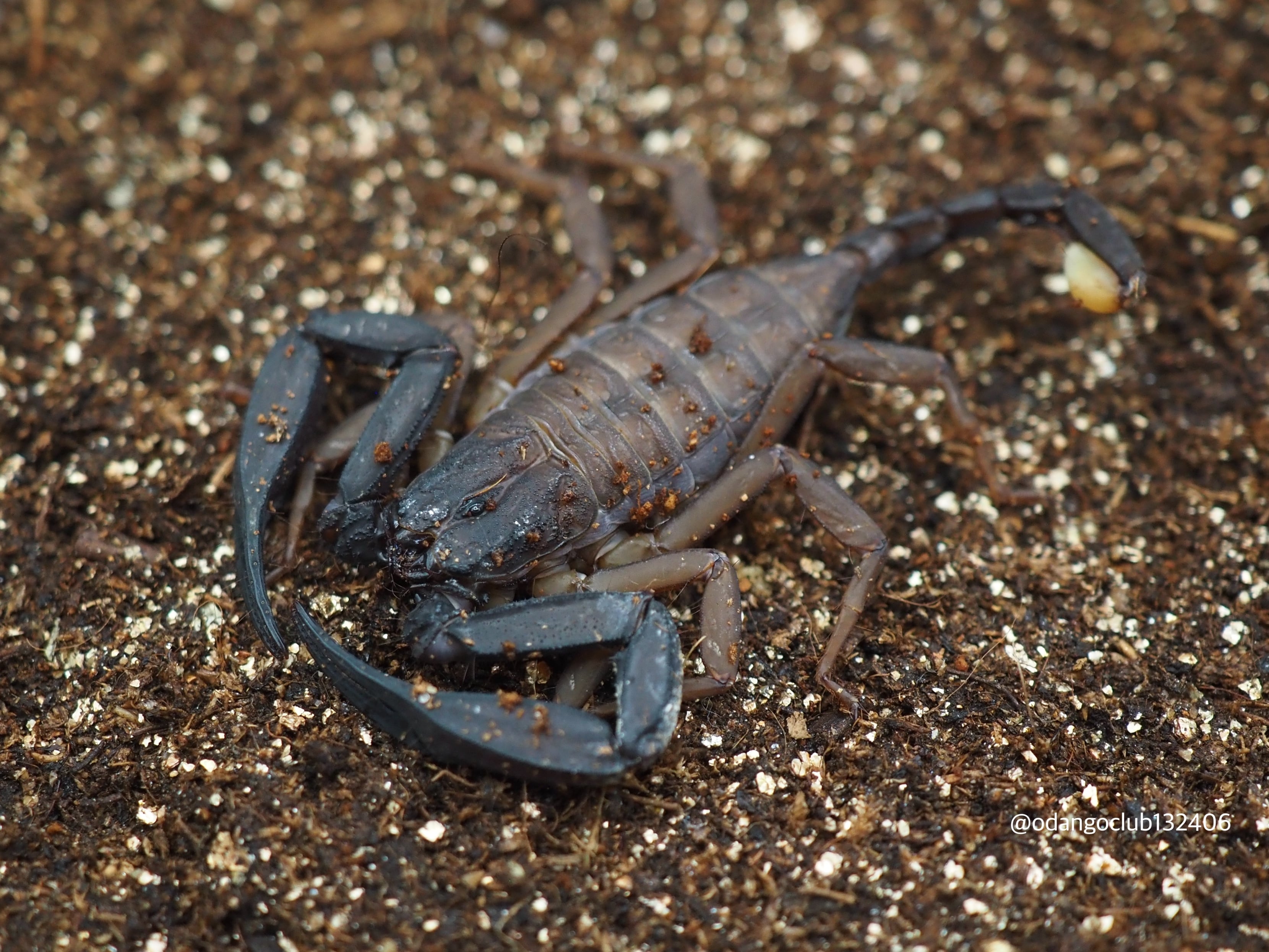 黒茶色の平べったい体にシャープなハサミが格好良く、黄色みを帯びた歩脚が美しいサソリです。