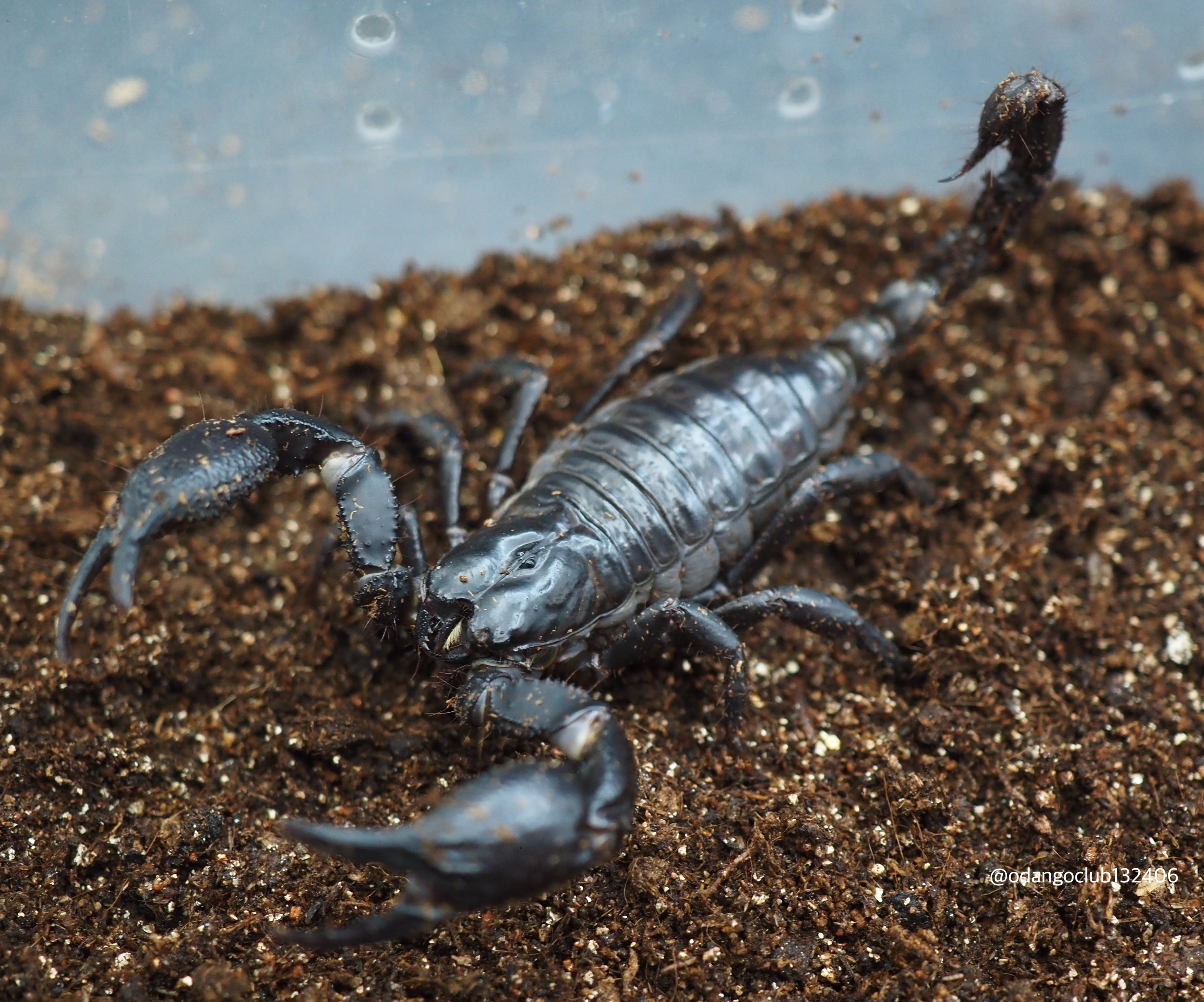 黒色の艶感の少ない体に大きな鋏が格好良いサソリです。