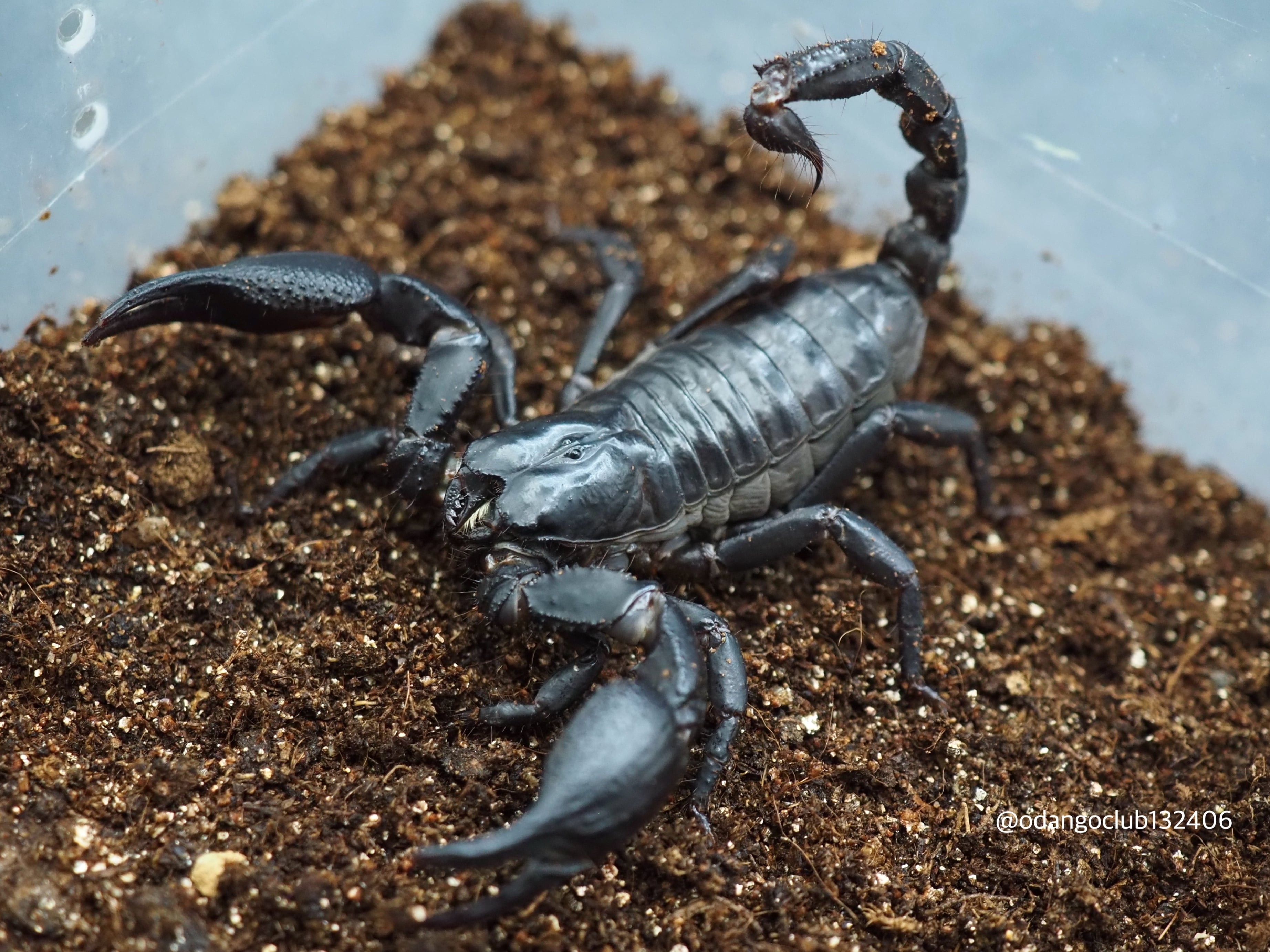 黒色の艶感の少ない体に大きな鋏が格好良いサソリです。