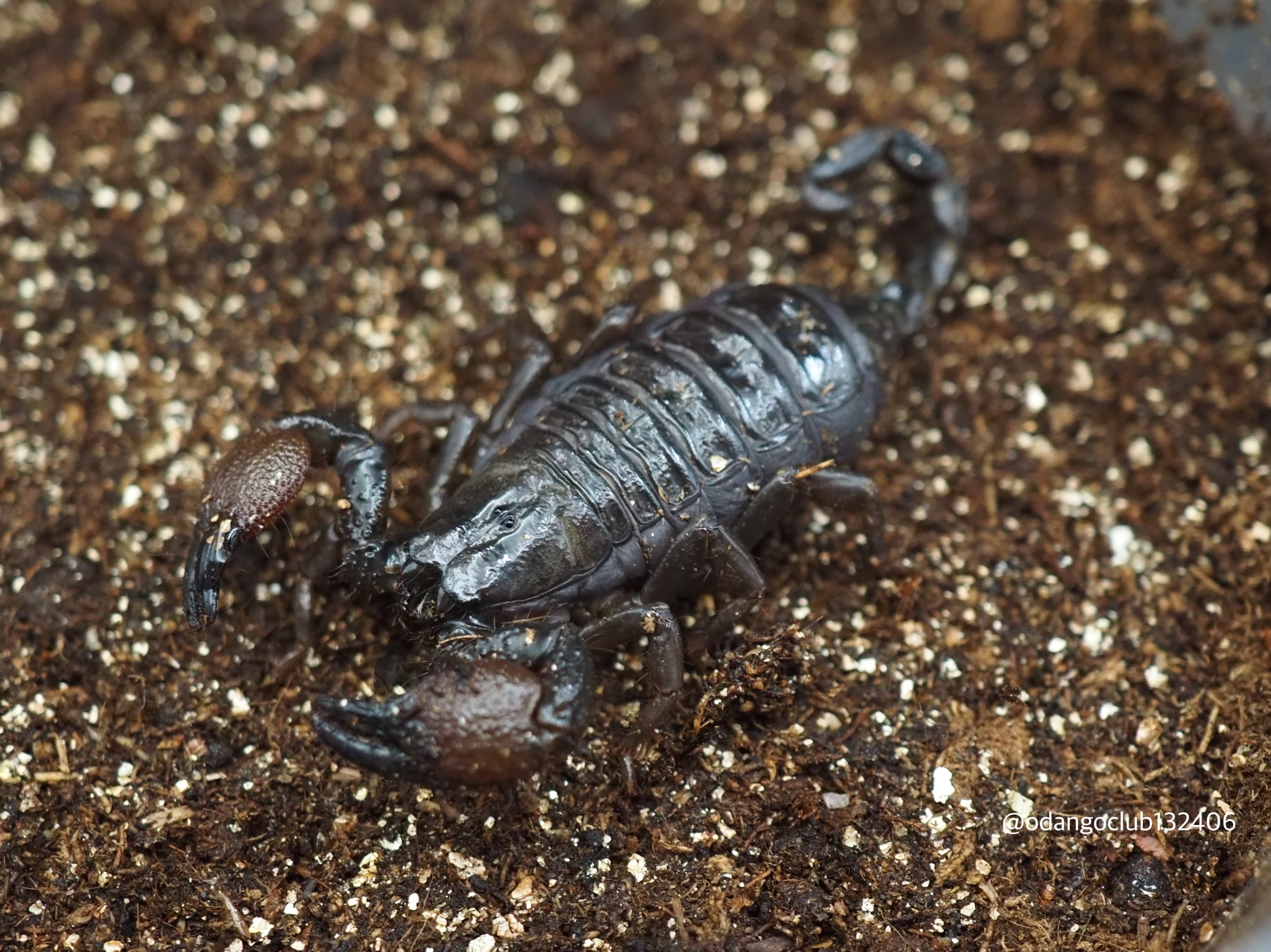 成長すると茶色の体に薄いオレンジ色の歩脚、オレンジ色のハサミの美しいサソリになります。