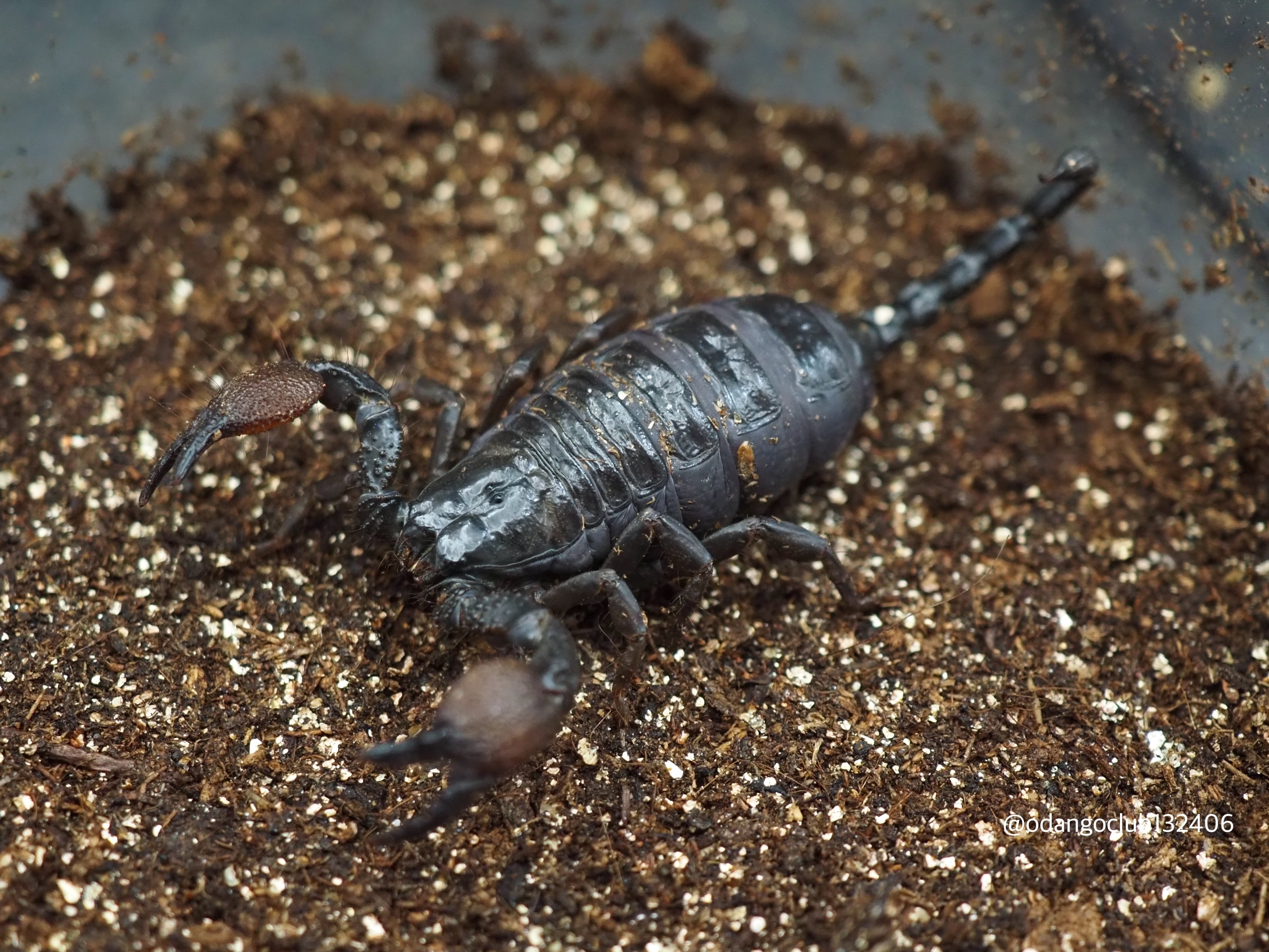 成長すると茶色の体に薄いオレンジ色の歩脚、オレンジ色のハサミの美しいサソリになります。