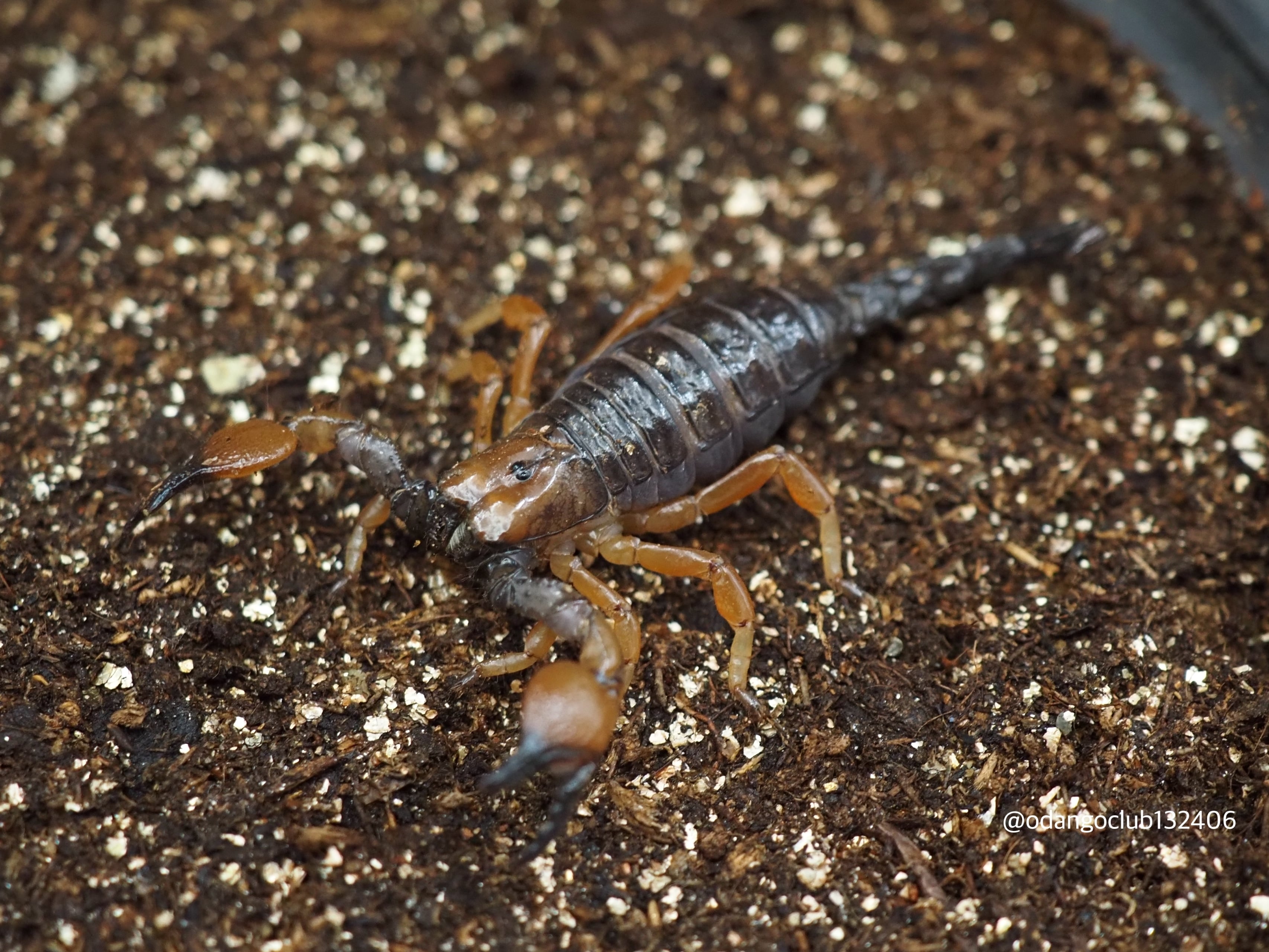 成長すると黒っぽい体にオレンジ色の歩脚、オレンジ色のハサミの美しいサソリになります。