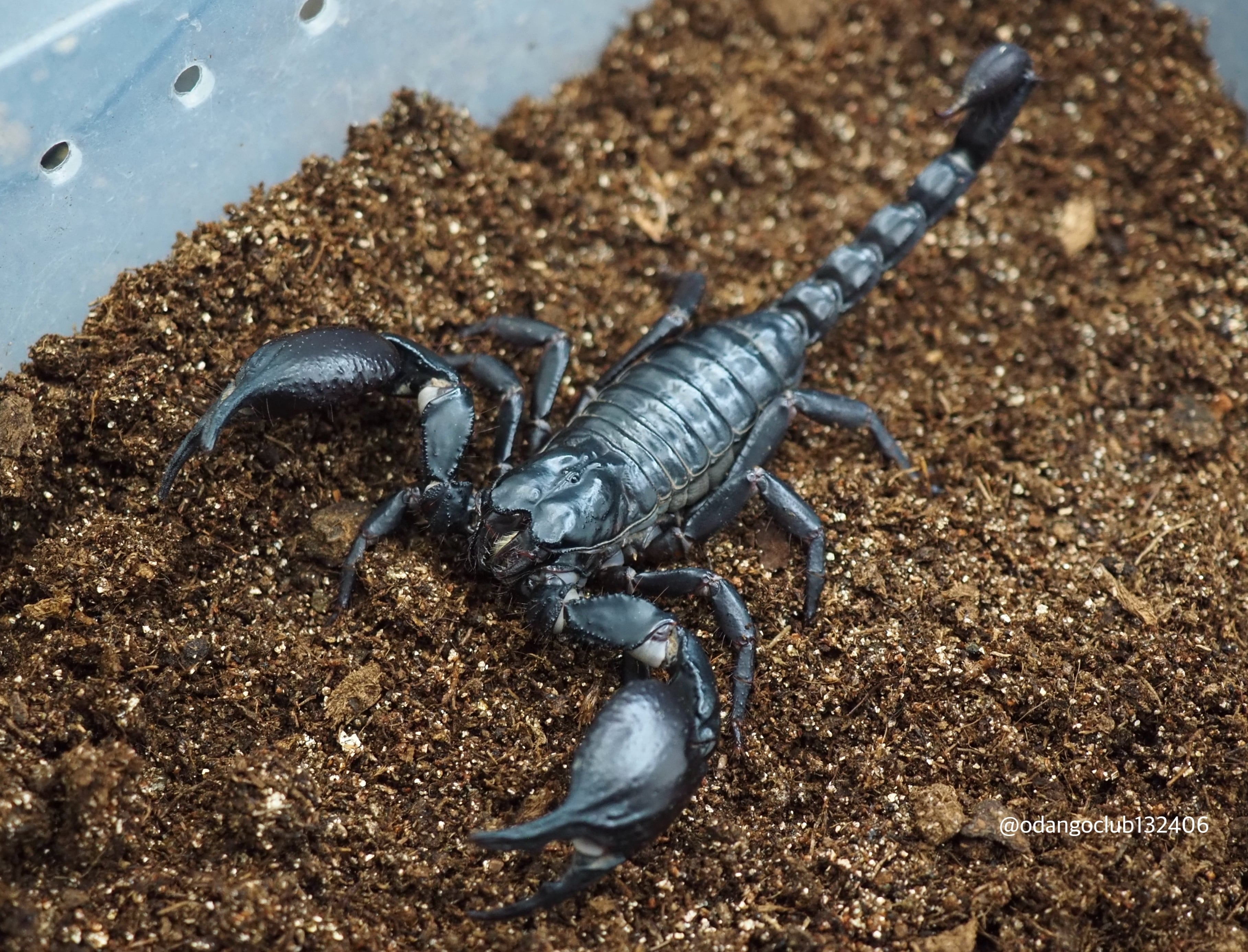 黒色の艶感の少ない体に大きな鋏が格好良いサソリです。