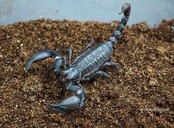 黒色の艶感の少ない体に大きな鋏が格好良いサソリです。