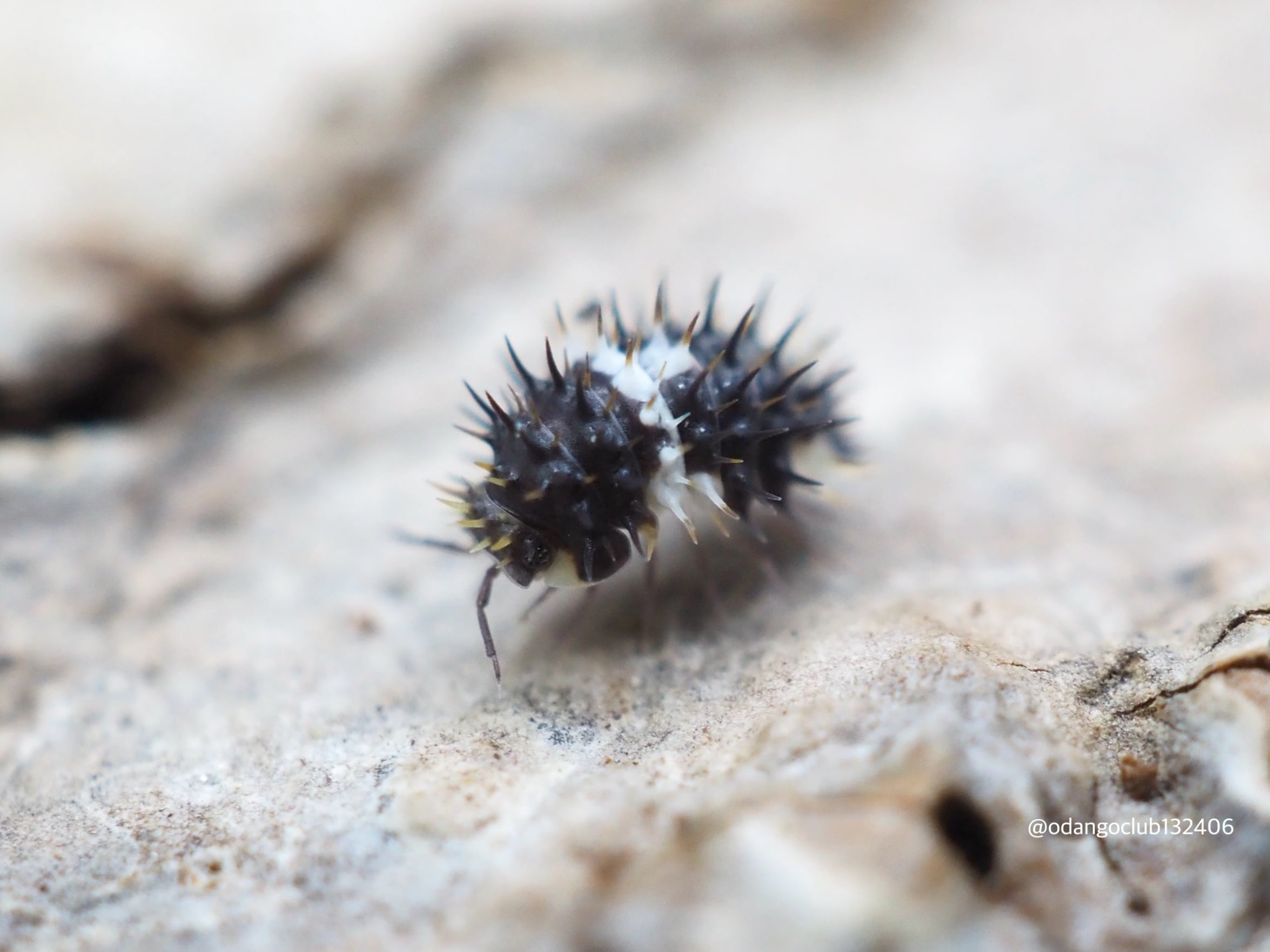白色と黒色の体をしたトゲトゲのダンゴムシです。