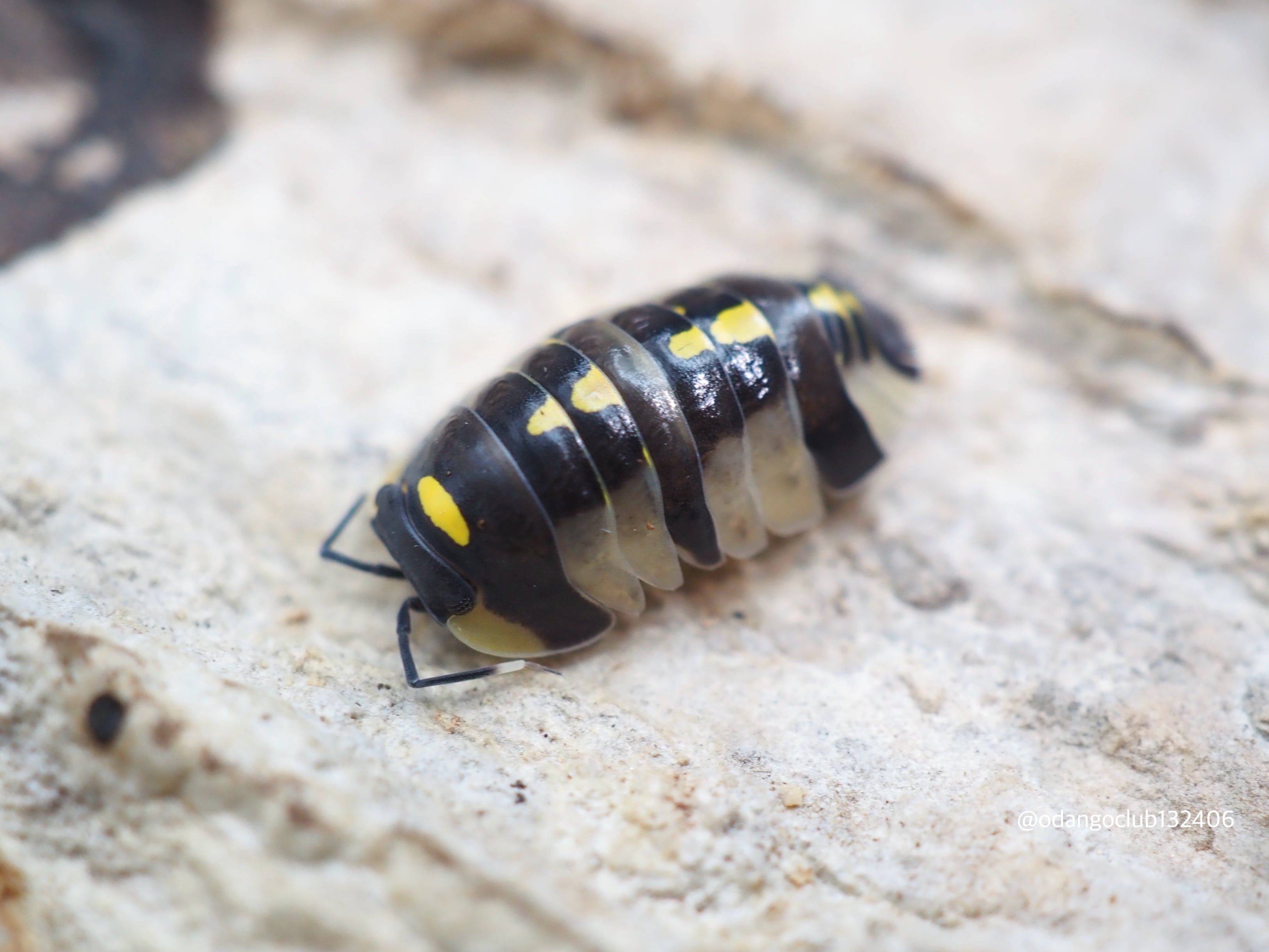 黒色の体に黄色のスポットが入り、側面には赤色が入る美しいダンゴムシです。