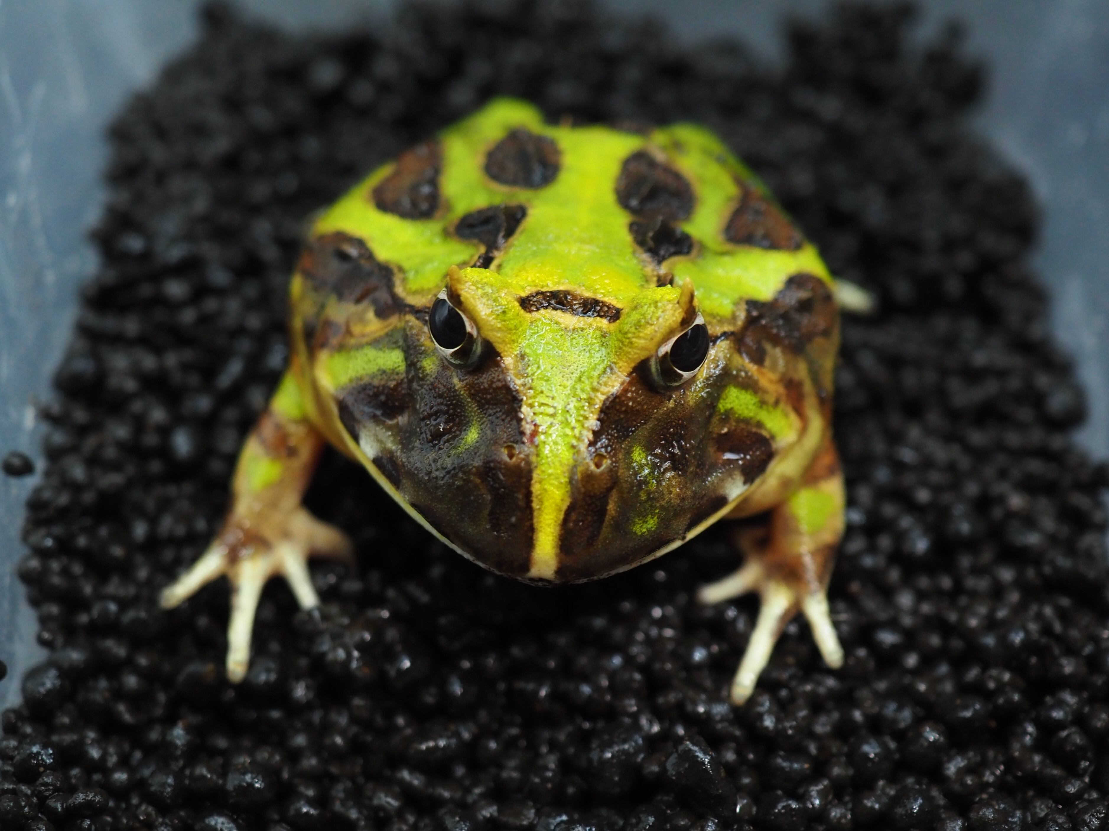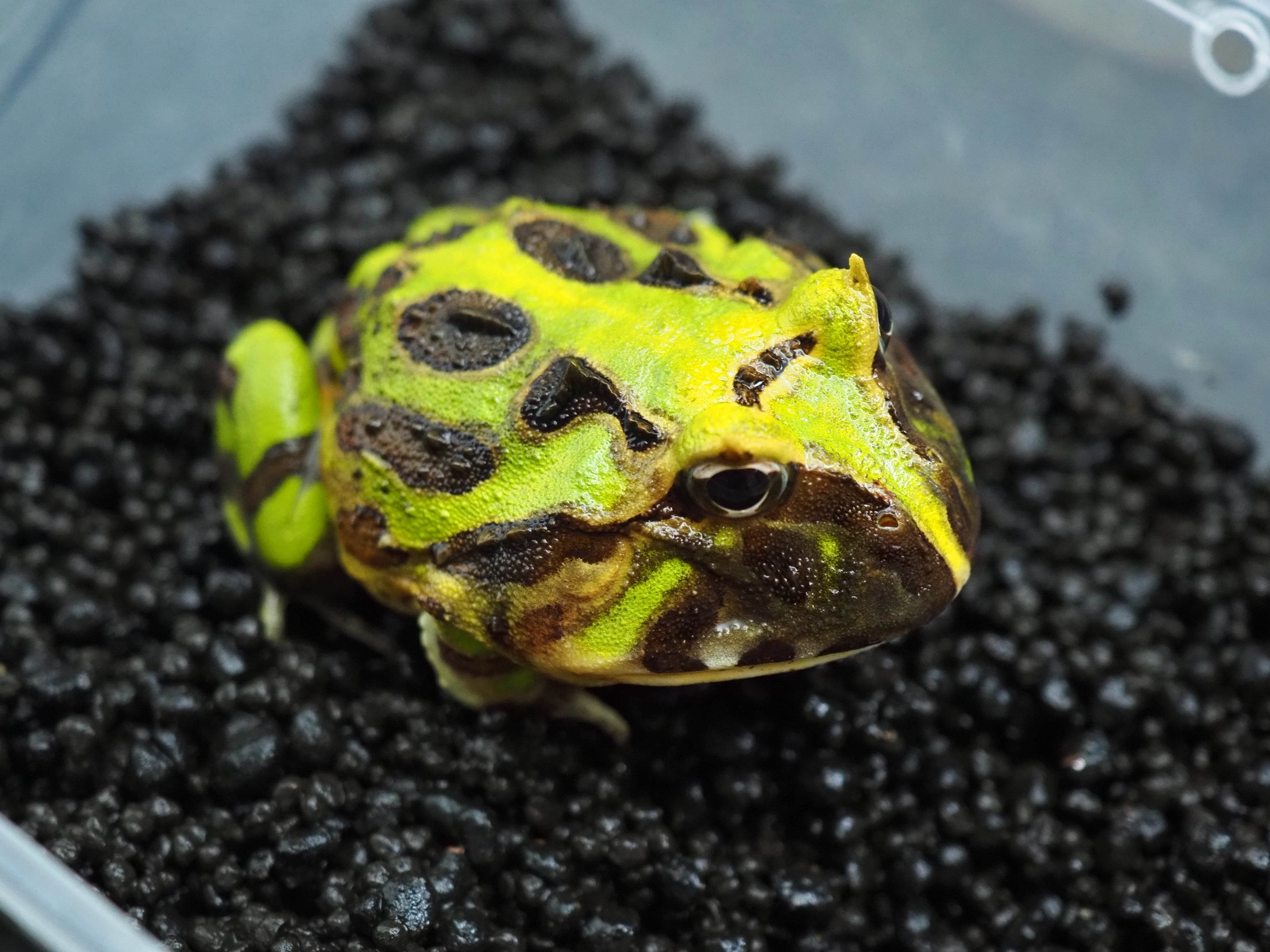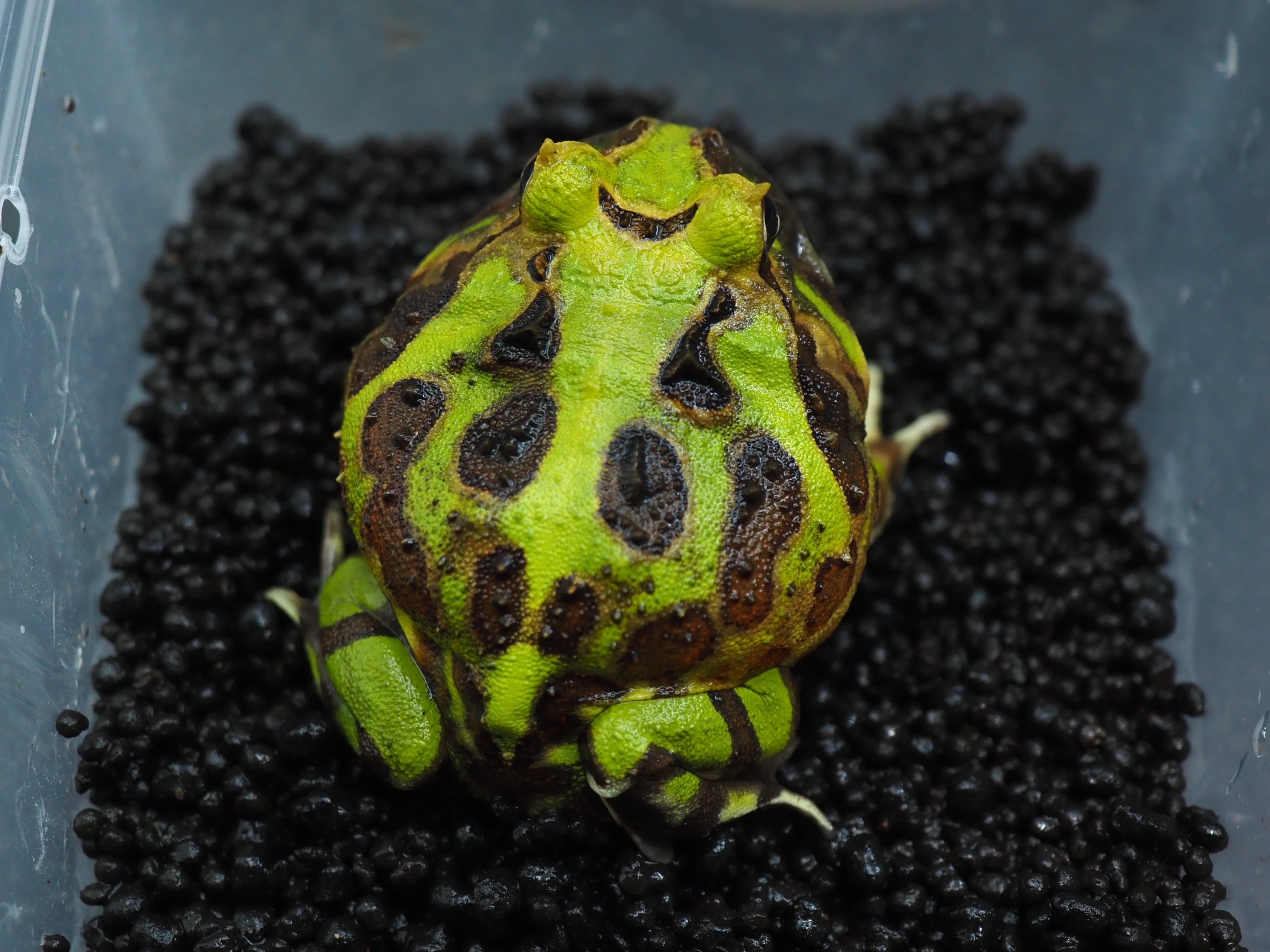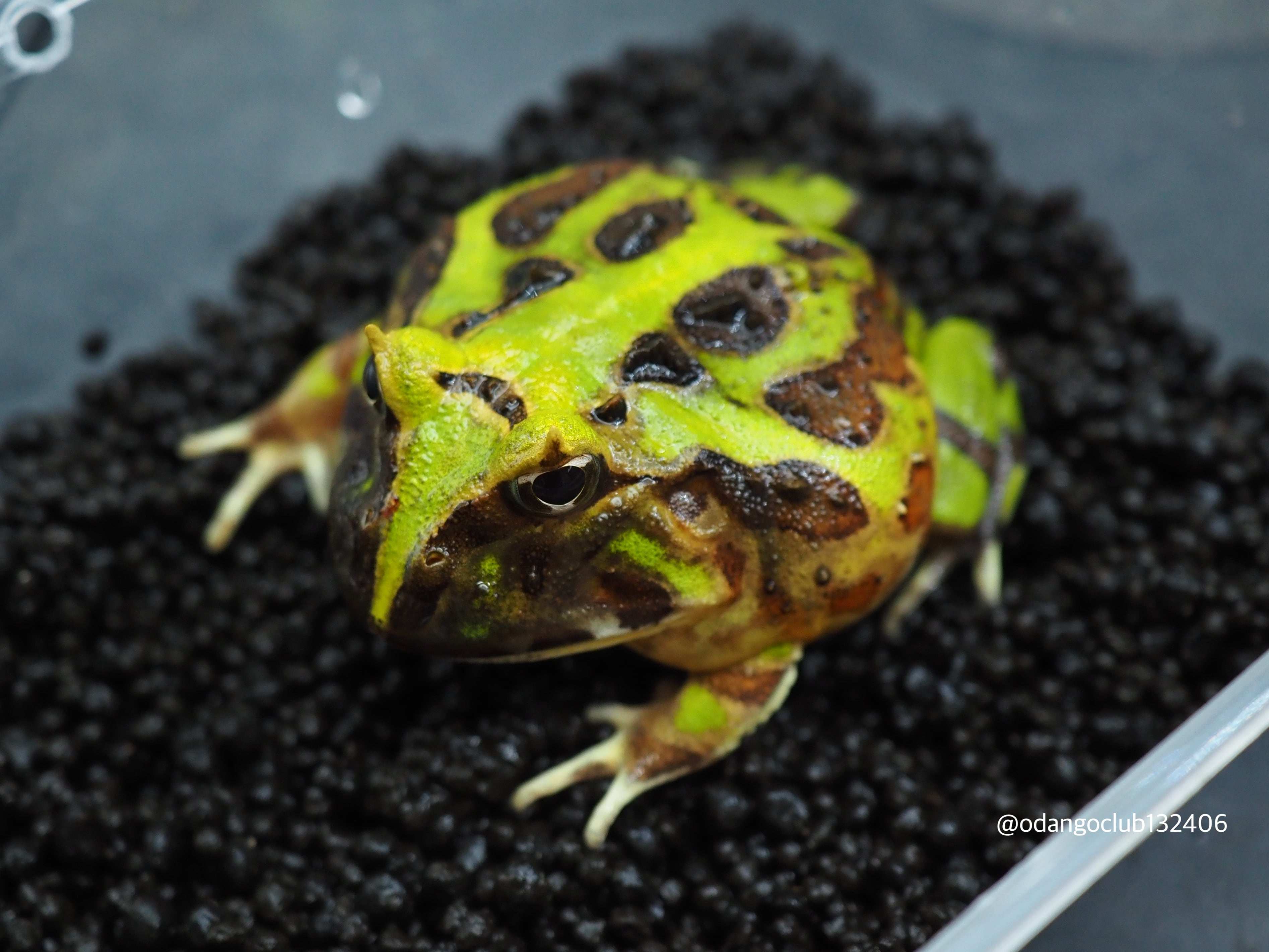 黄緑色の体に大きな焦げ茶色の模様が入る美しい個体です。