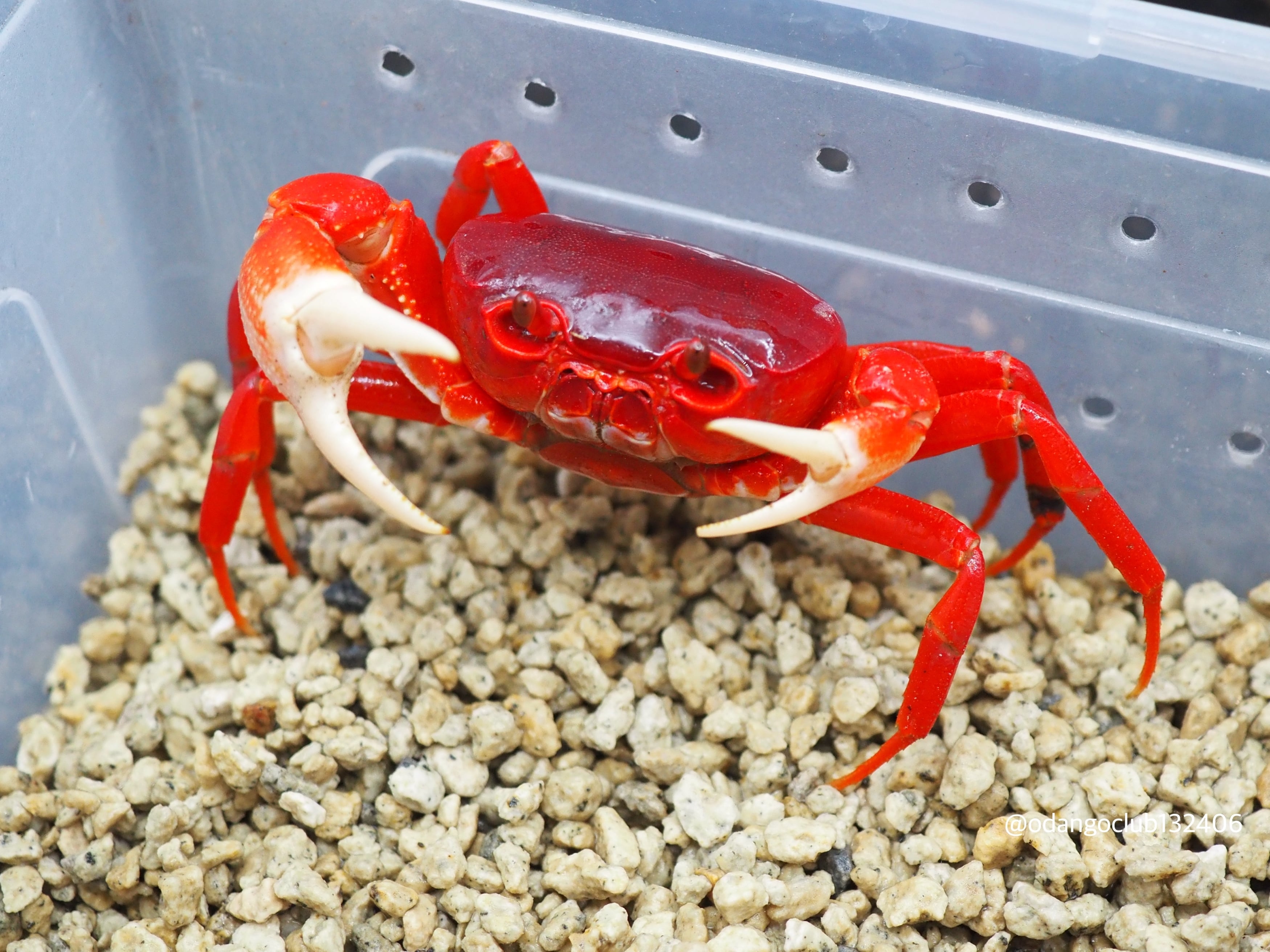 燃えるような赤色の体に大きなハサミが特徴的なカニです。