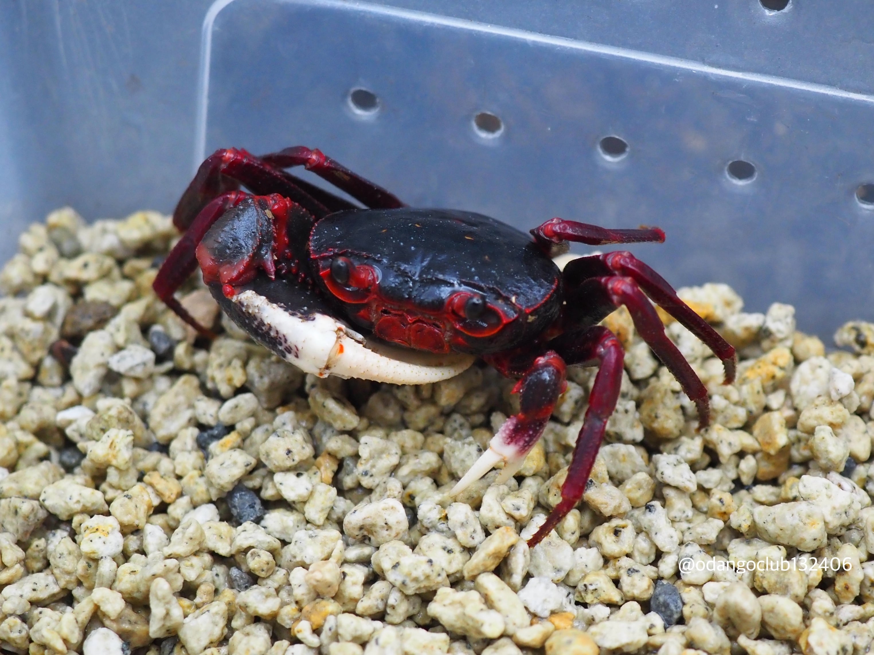 赤色と黒色の体に白色のハサミが格好良いカニです。
