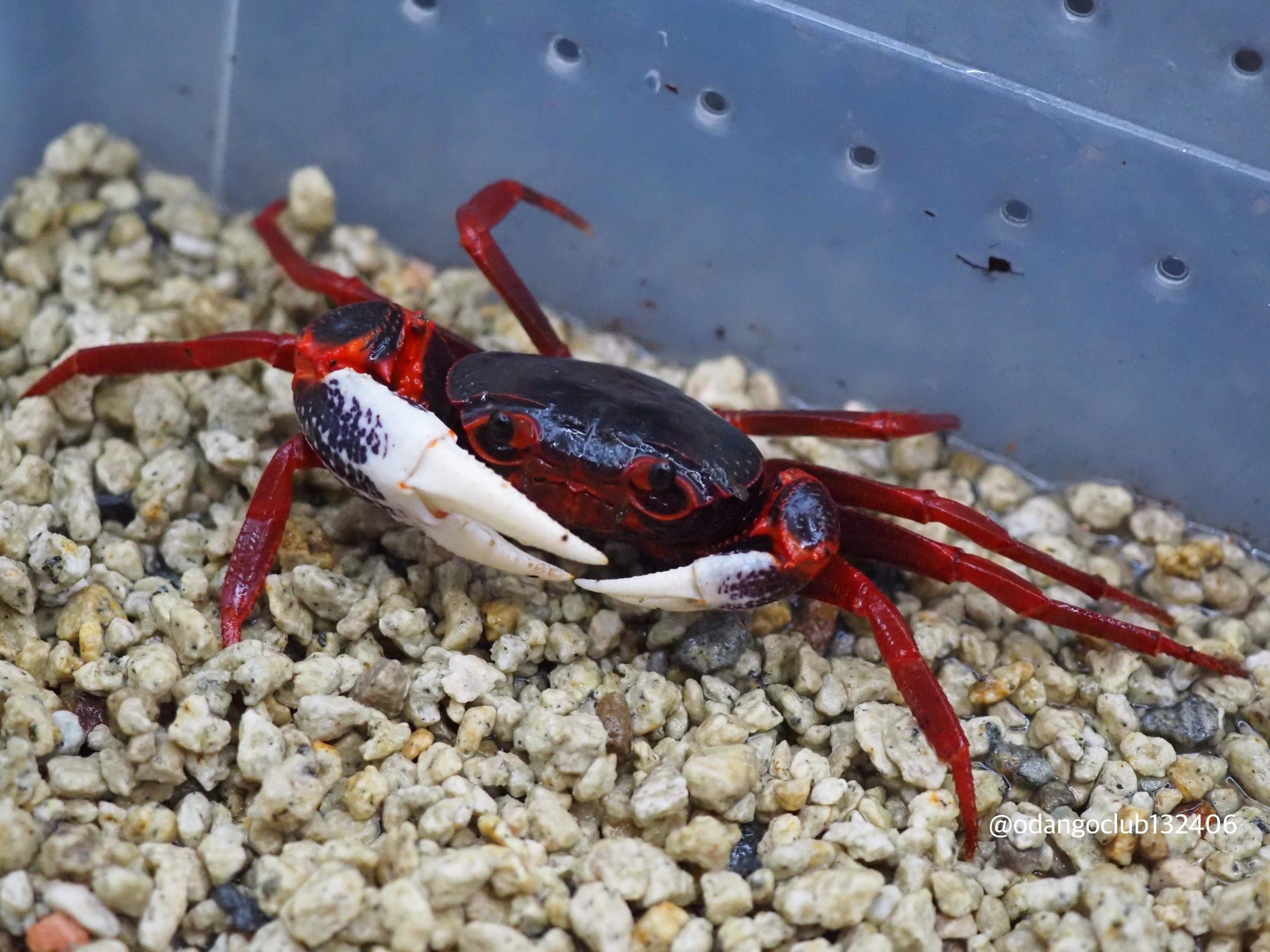 赤色と黒色の体に白色のハサミが格好良いカニです。