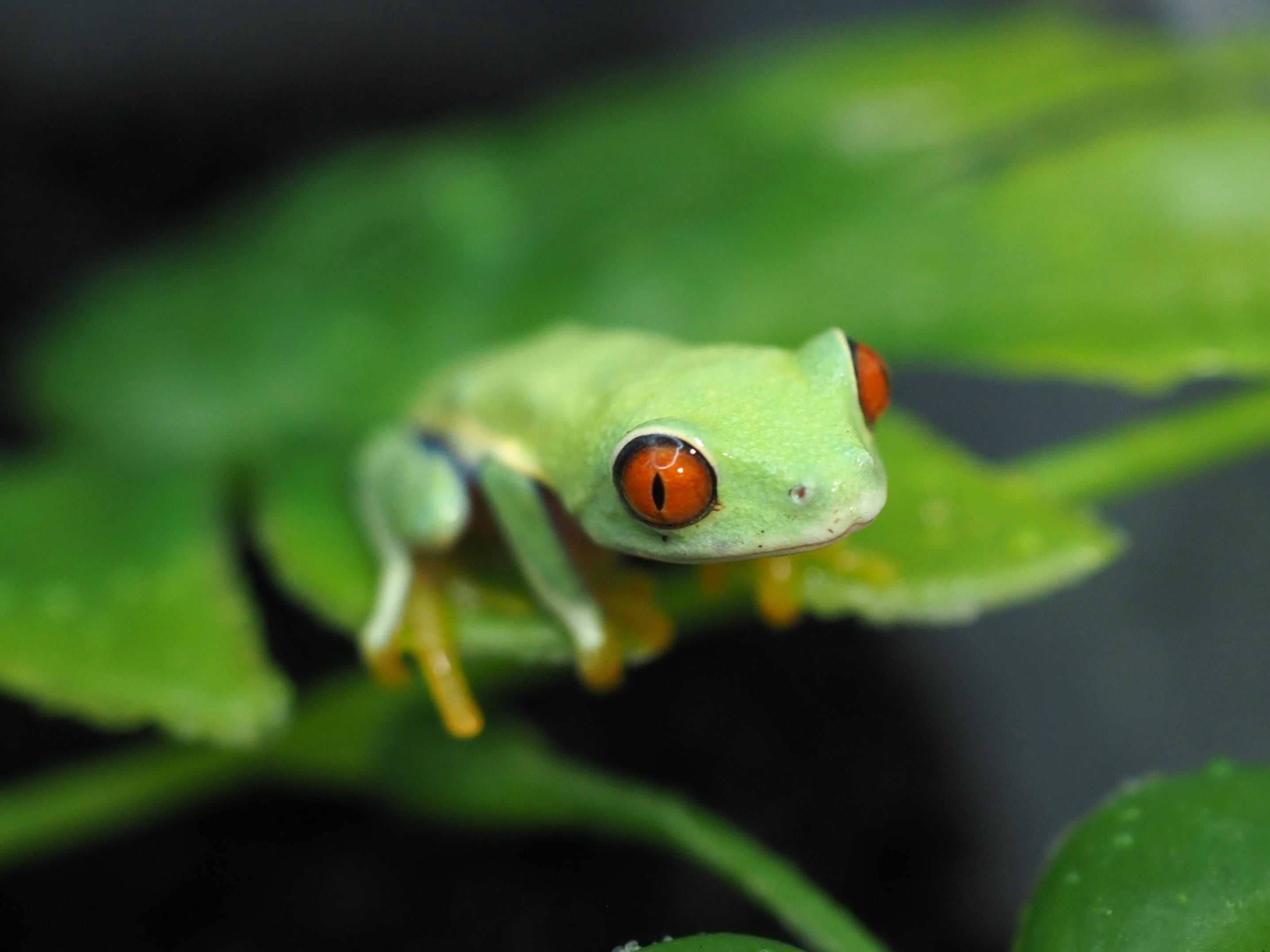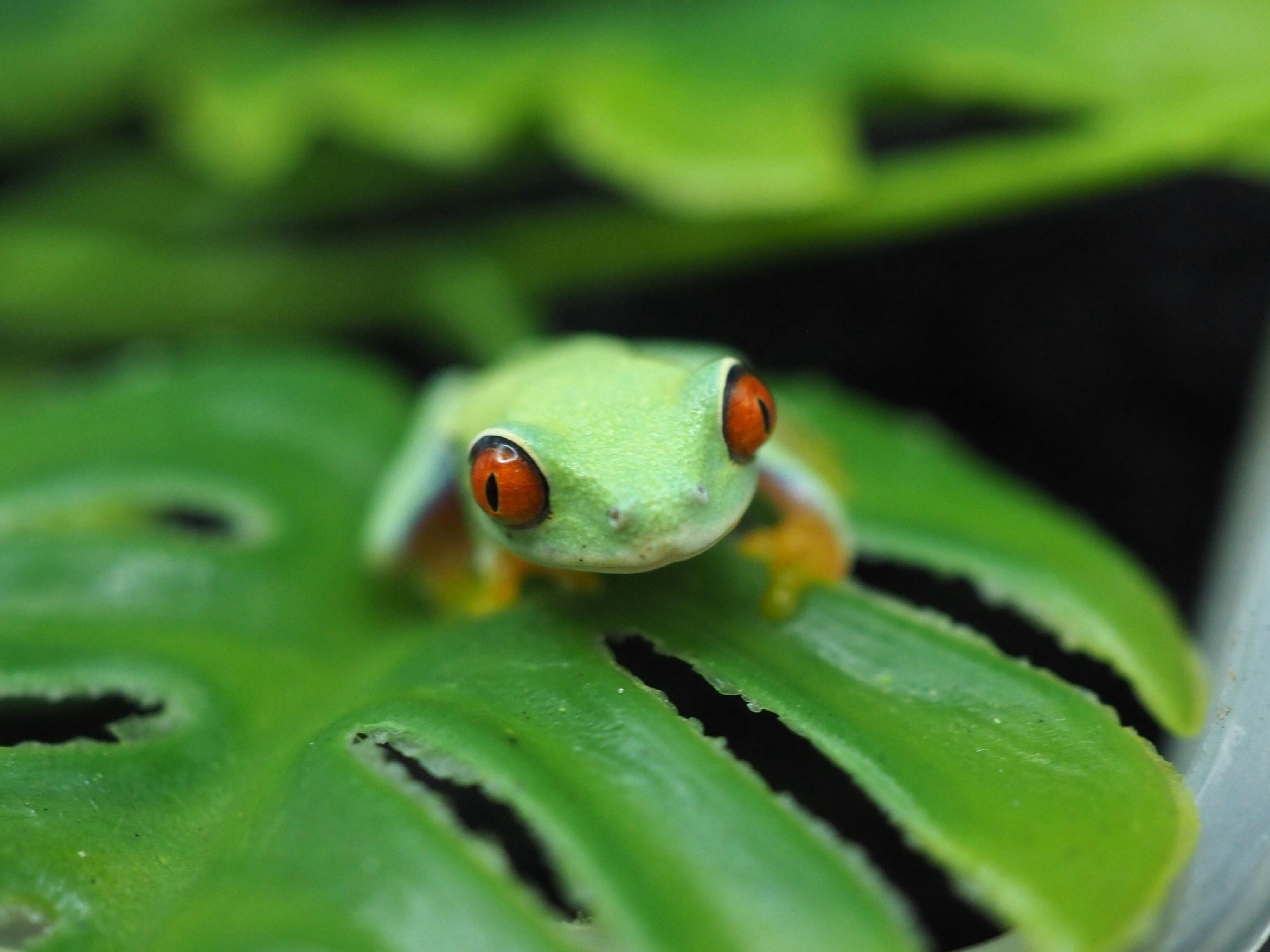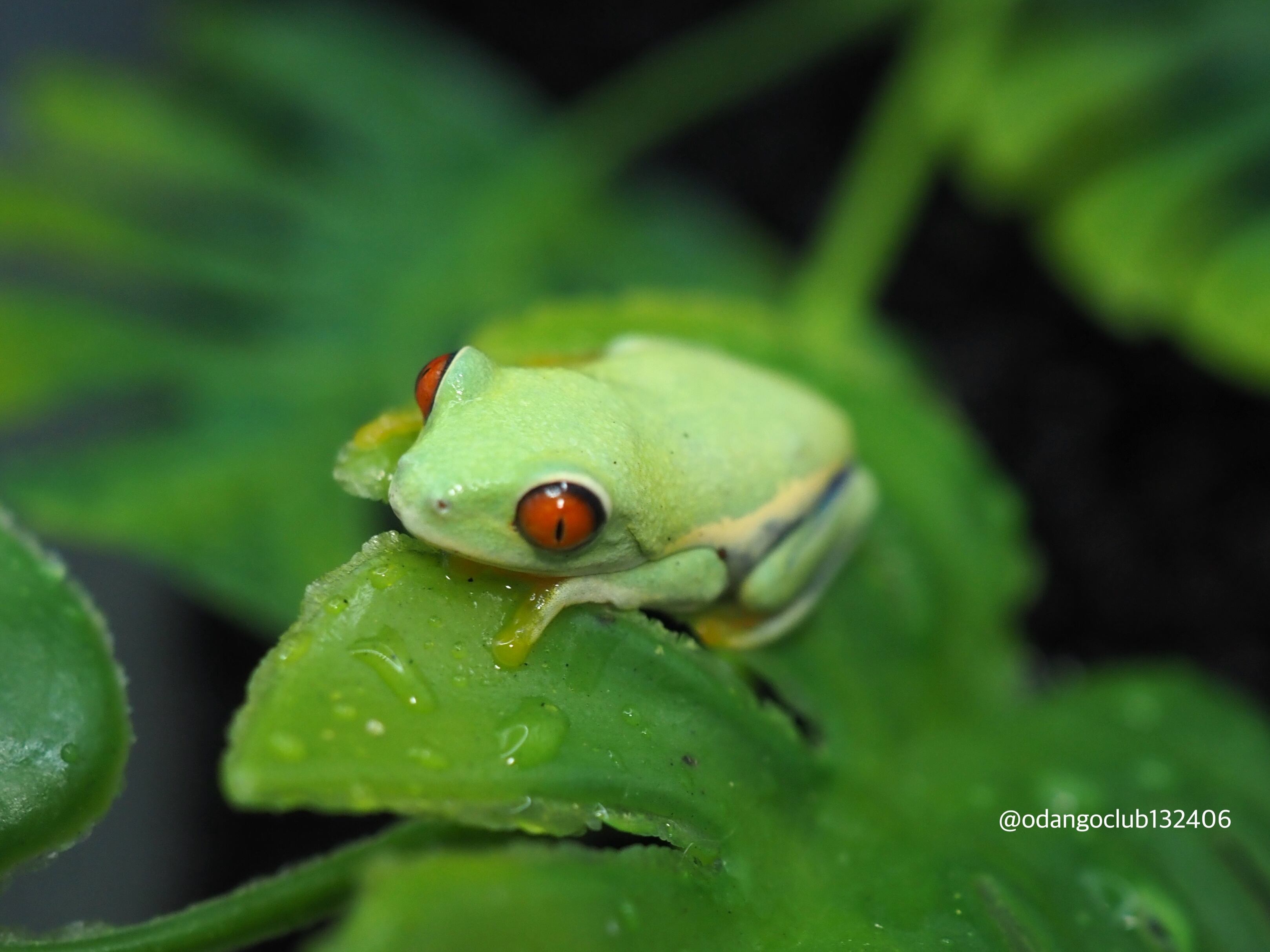 黄緑色の体に赤色の目が特徴的な可愛いカエルです。