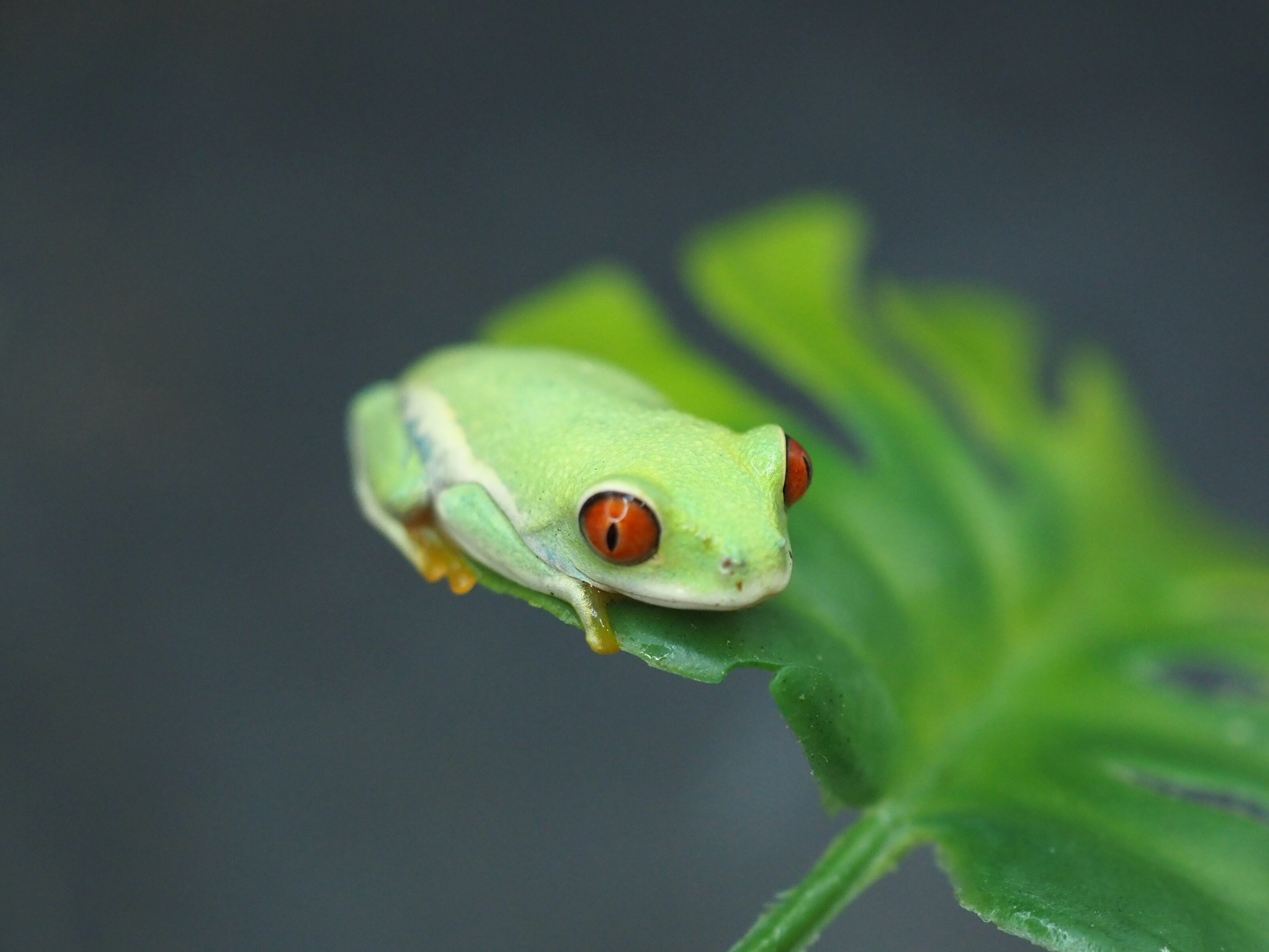 黄緑色の体に赤色の目が特徴的な可愛いカエルです。