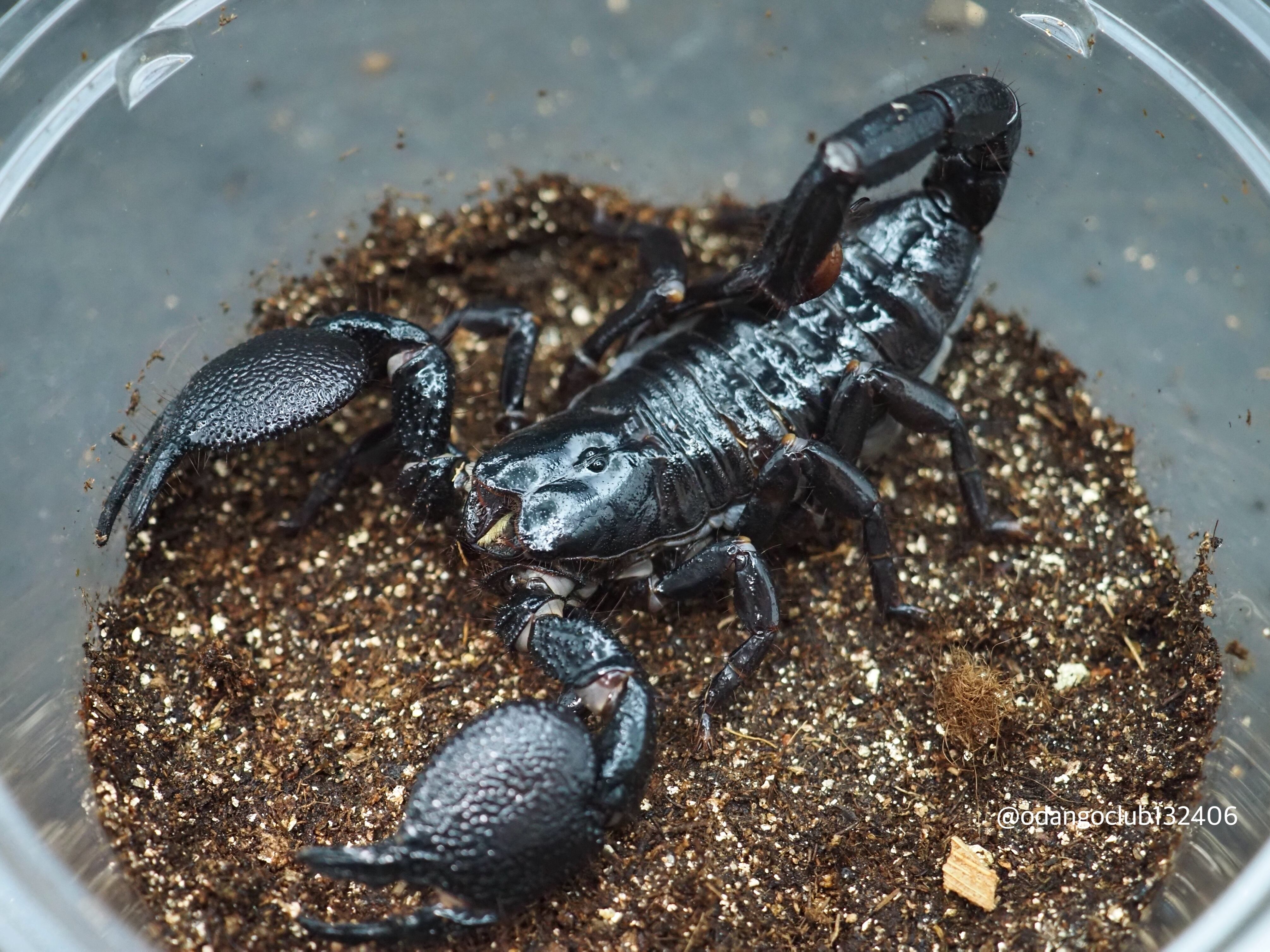 黒色の体に大きなハサミが格好良い世界最大級のサソリです。