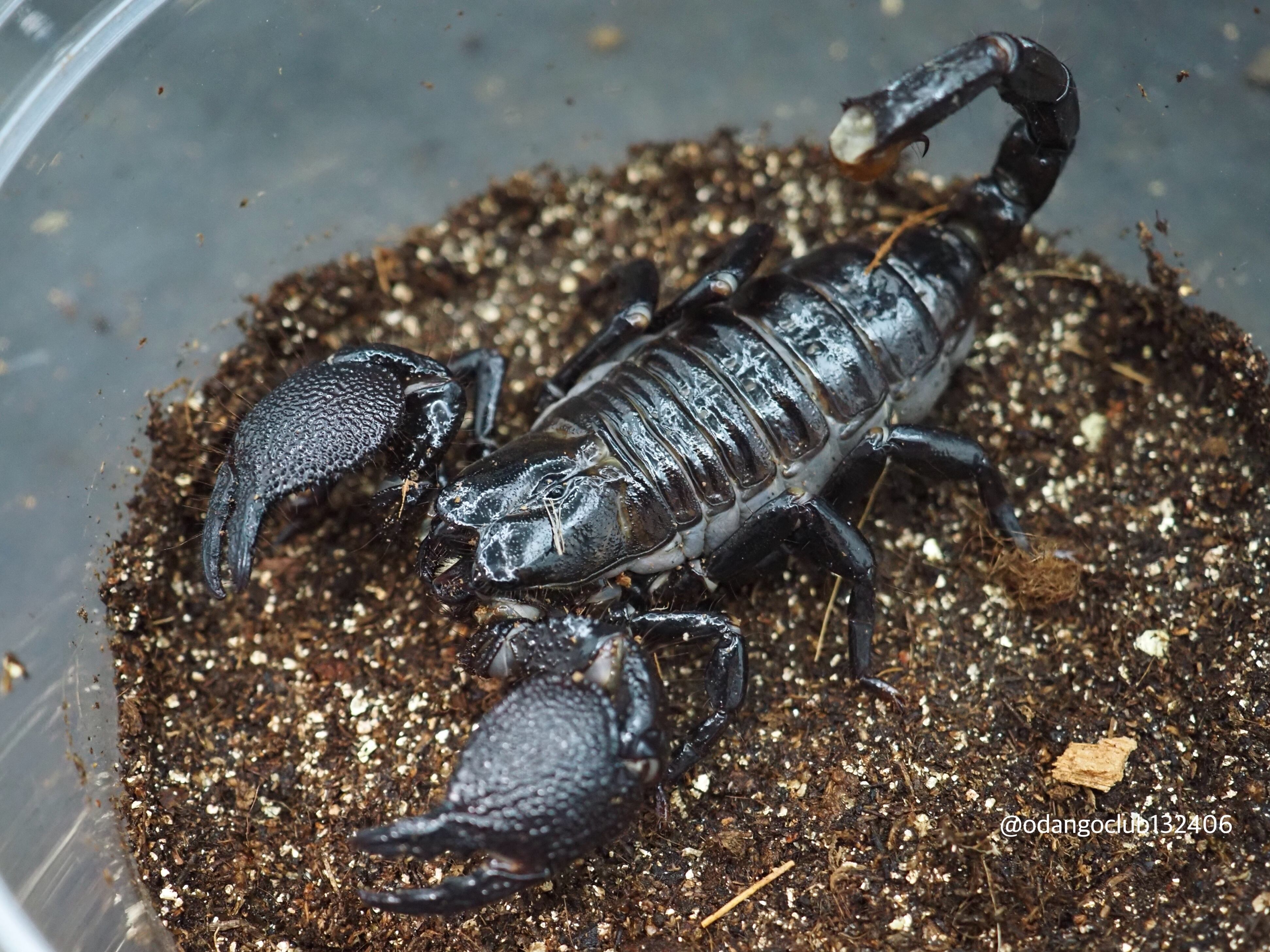 黒色の体に大きなハサミが格好良い世界最大級のサソリです。