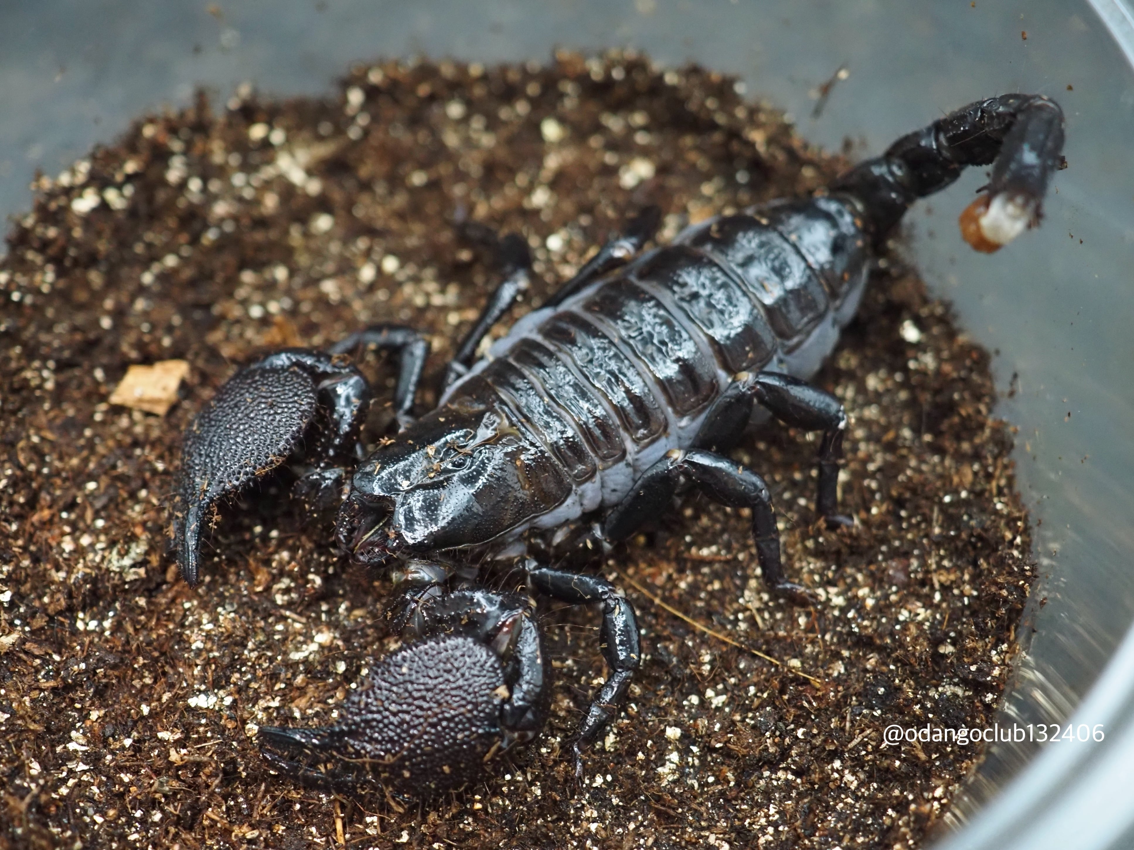 黒色の体に大きなハサミが格好良い世界最大級のサソリです。