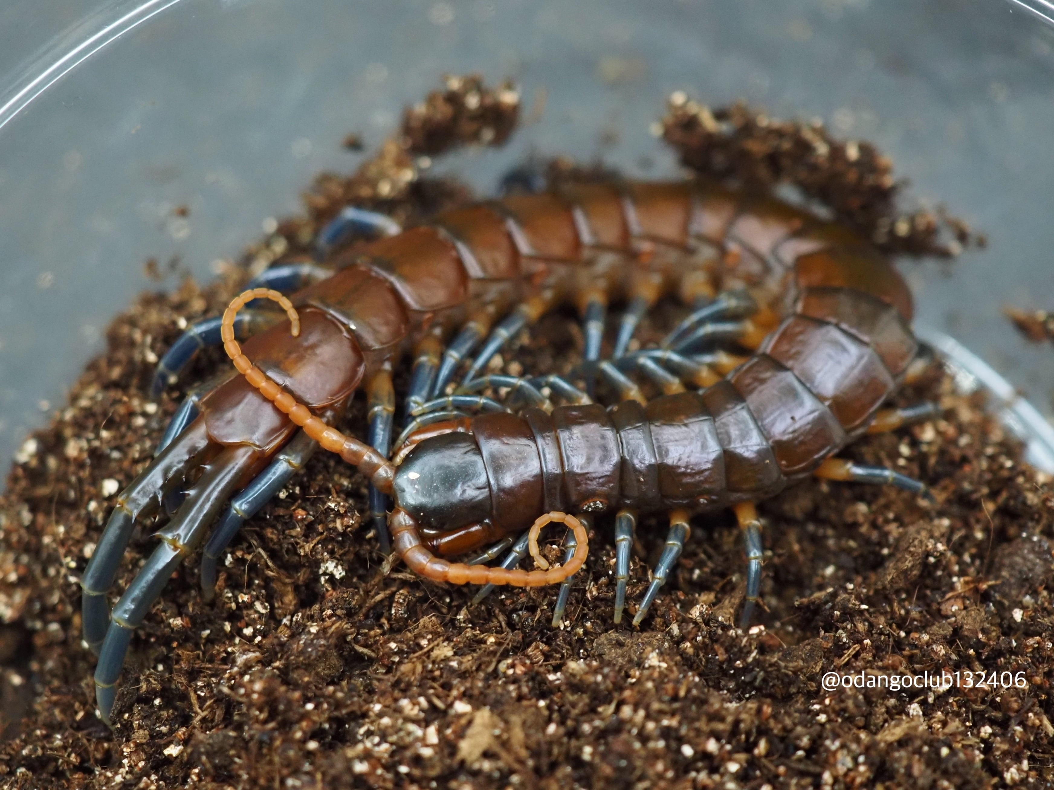 透け感のある茶色の体に美しい水色の脚が特徴的なムカデです。