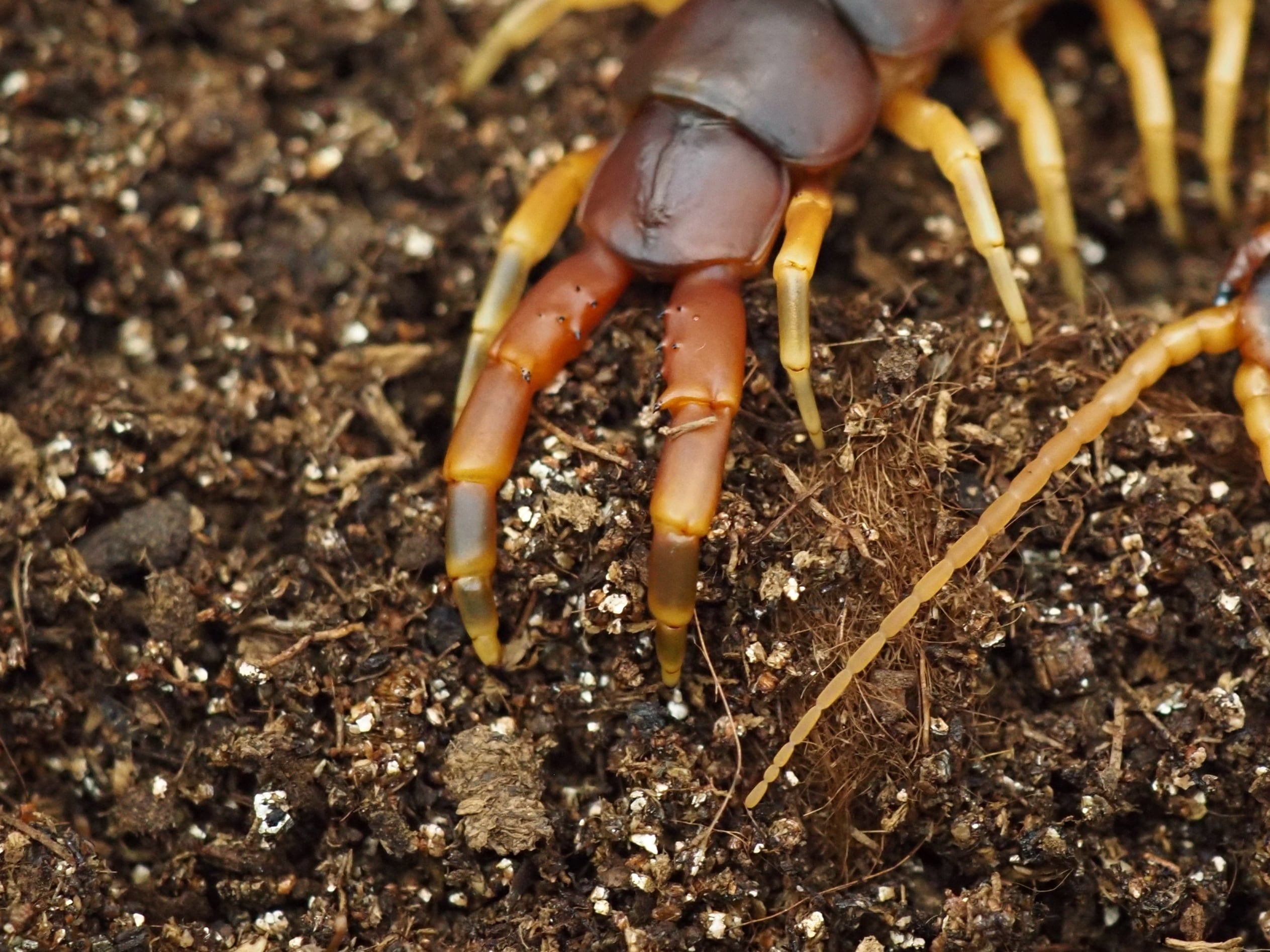 赤色と緑色を混ぜたような体にピンクがかった脇腹が非常に美しいムカデです。