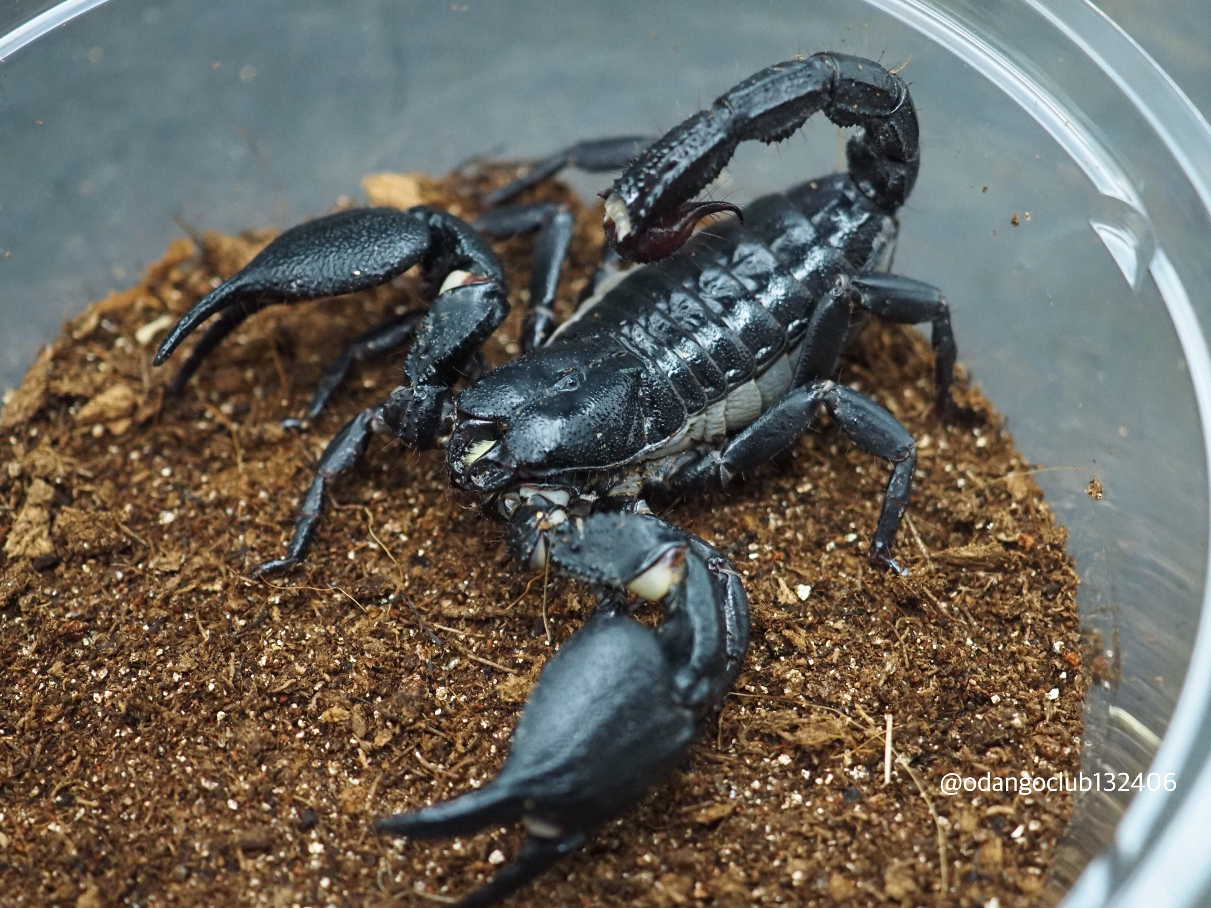 黒色の艶感の少ない体に大きな鋏が格好良いサソリです。