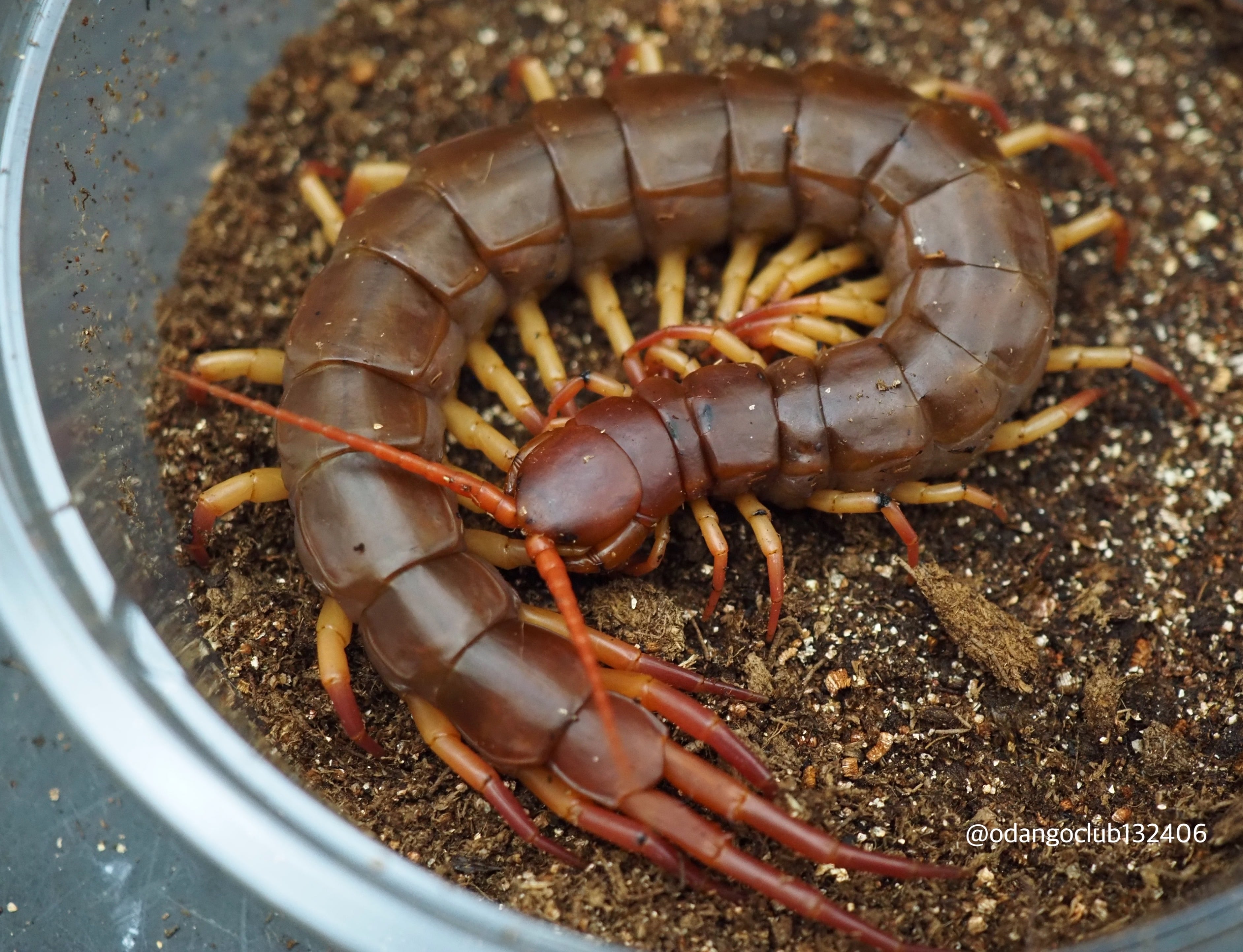 赤みを帯びた茶色の体にイエローレッグで足先が赤色になる非常に美しいムカデです。