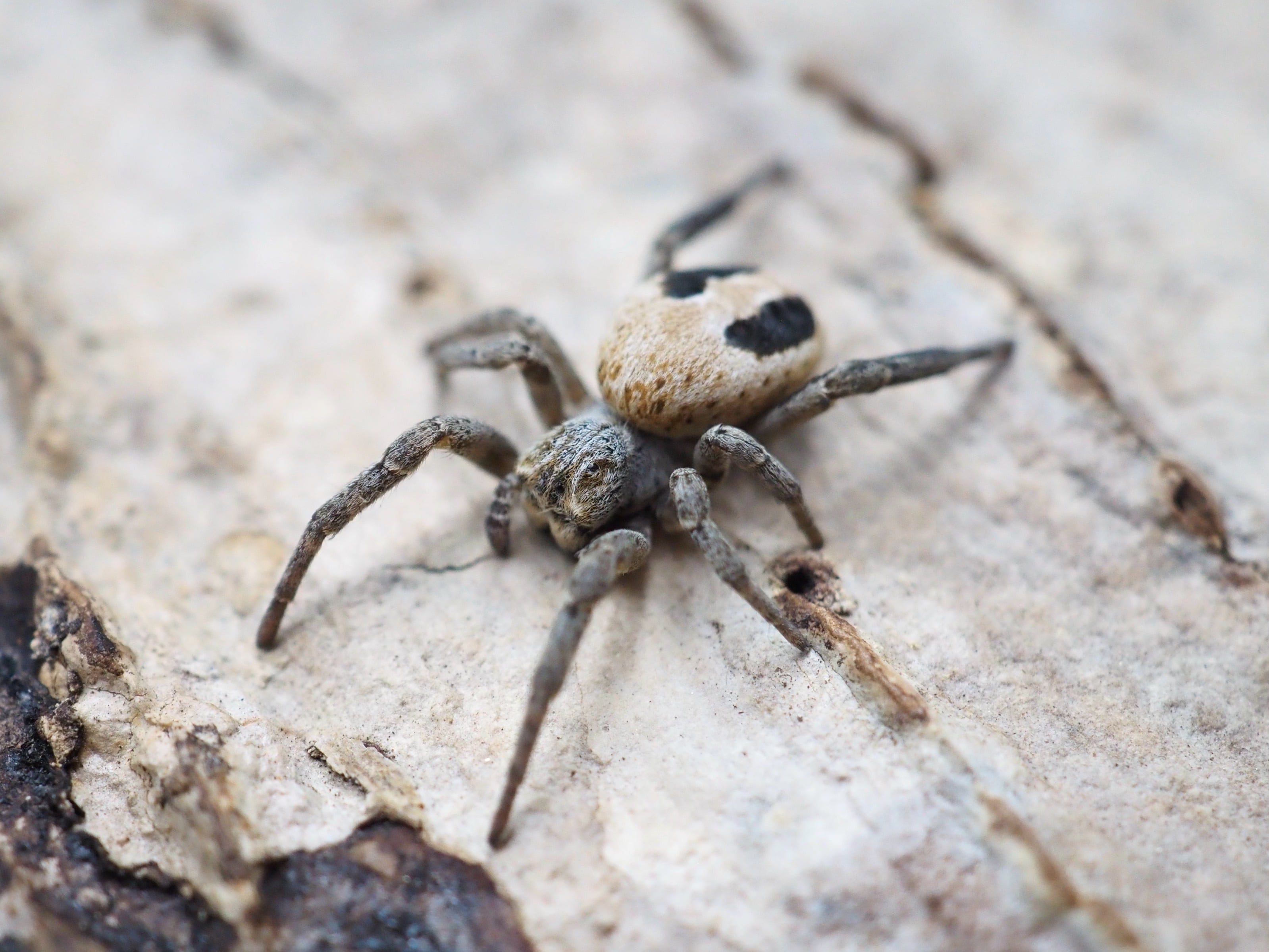 白っぽい体に2本の黒色の線が入るのが特徴的な蜘蛛です。