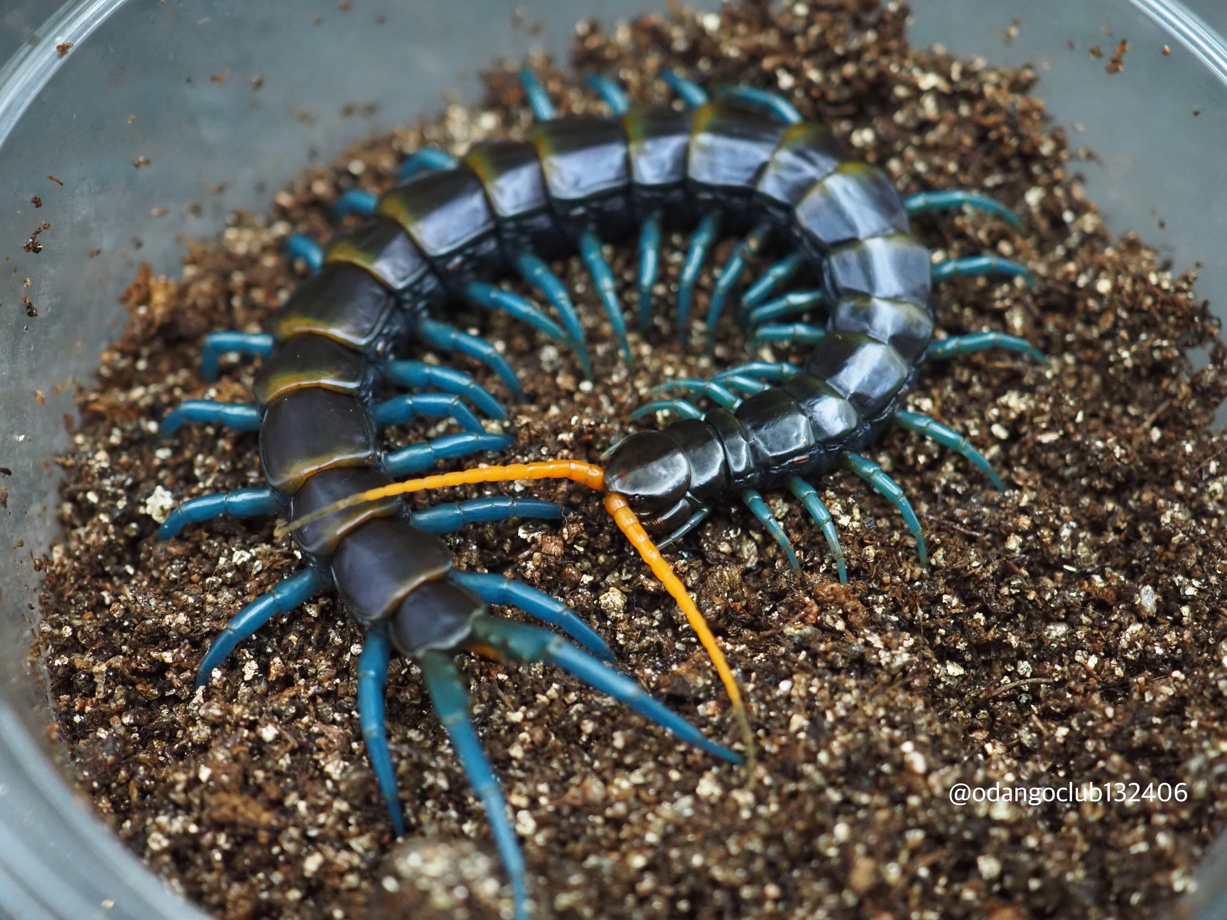 濃い青色に黄色が滲んでおり大変美しいムカデです。