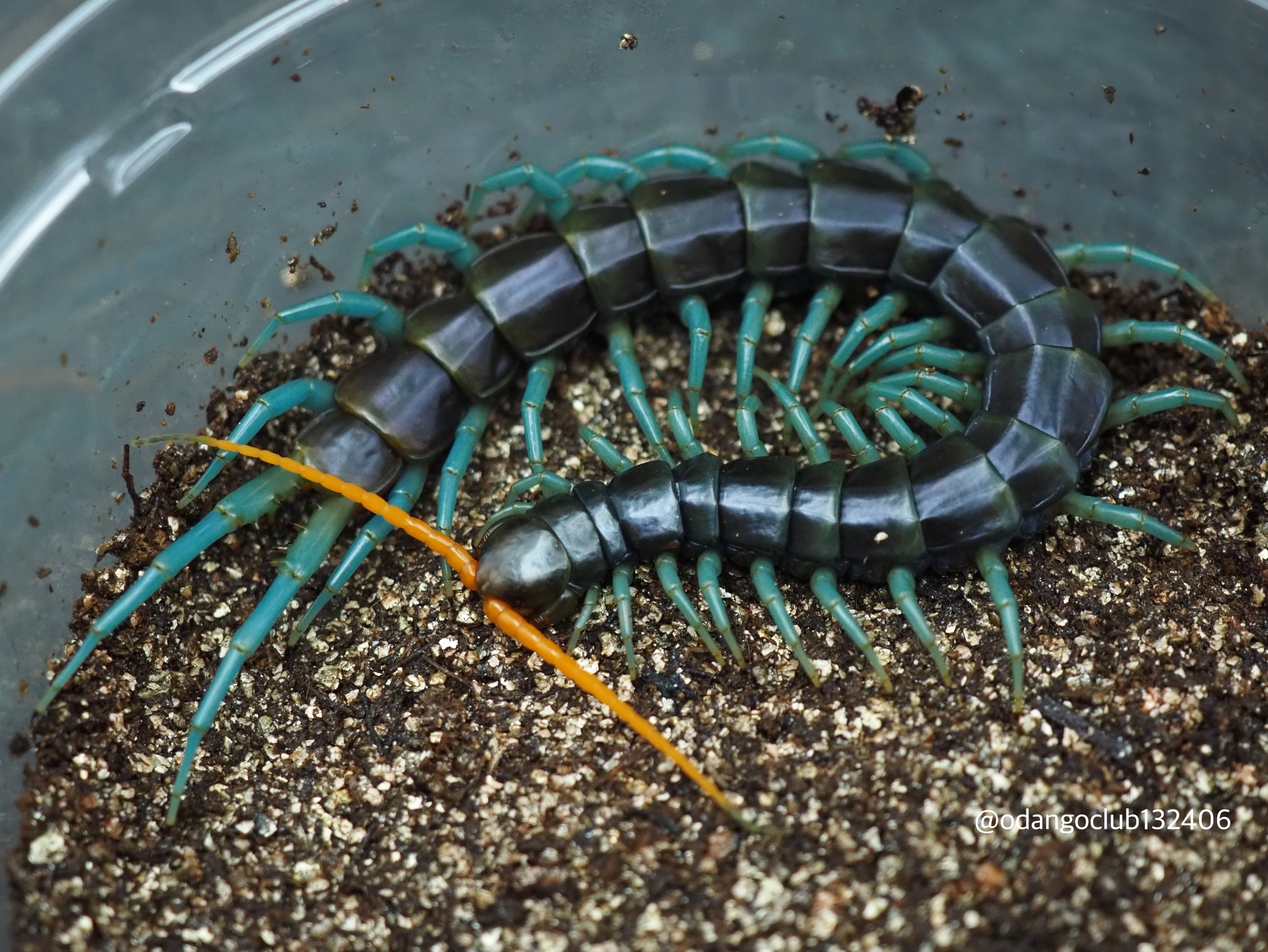 濃い青色に緑色のバンドが入り、ミントグリーンの歩脚が美しいムカデです。