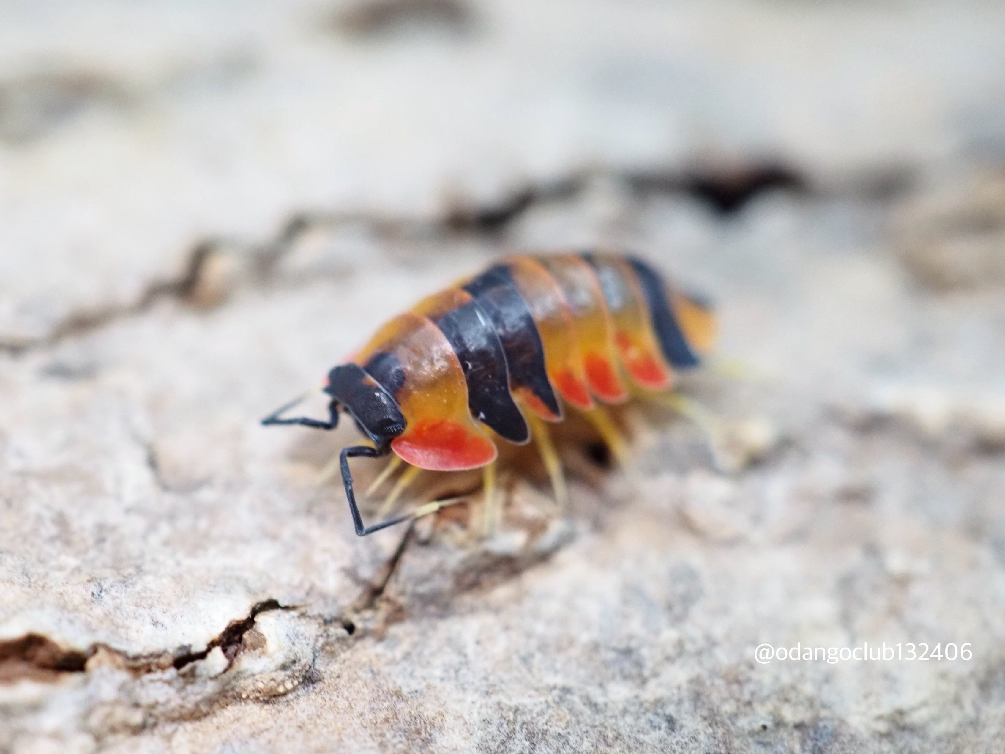 濃い黄色の体に赤色、黒色が入る美しいダンゴムシです。