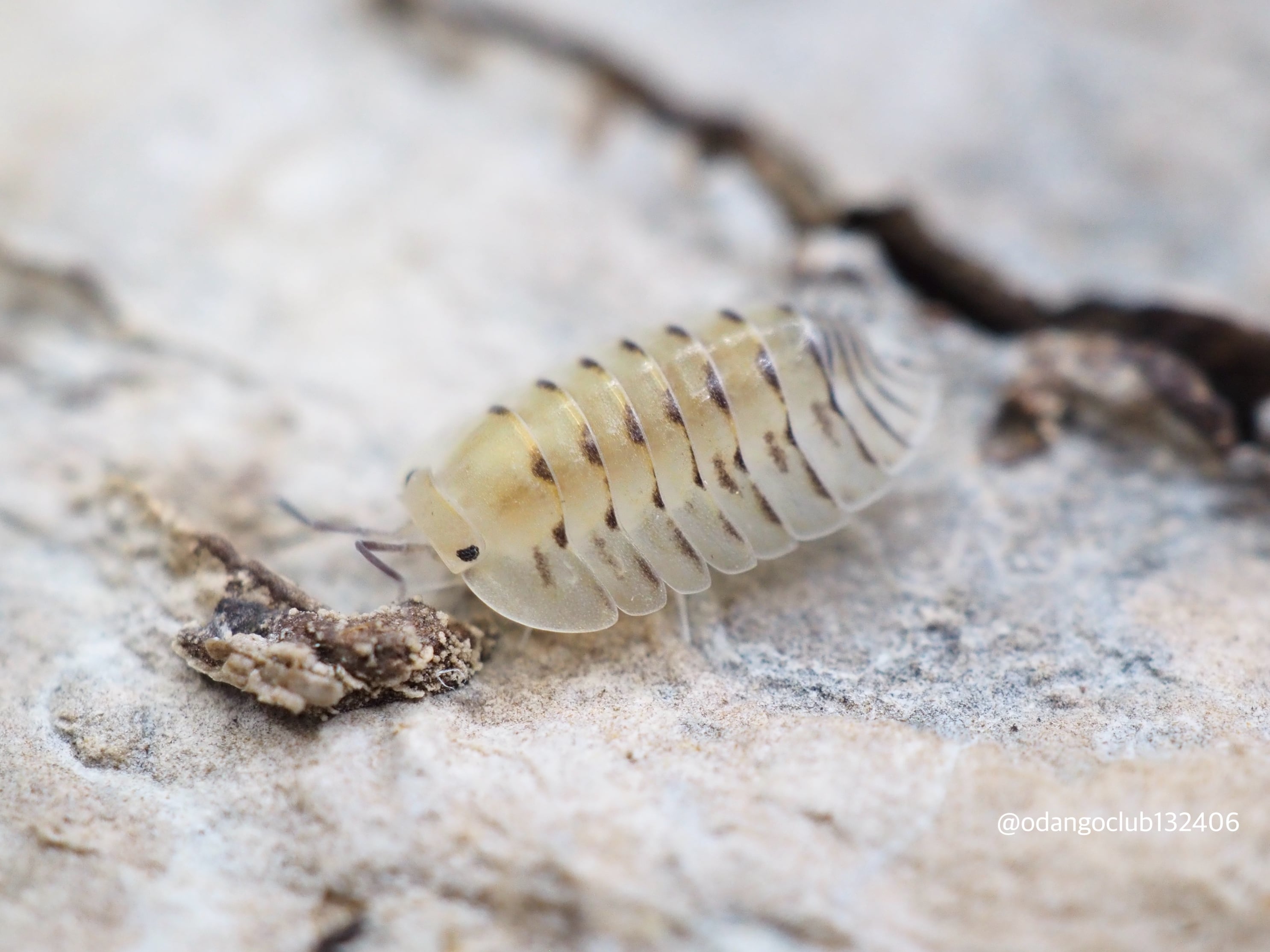透き通る白い体をしており、体節の所々に黒が入るドラゴンフルーツのようなカラーリングのダンゴムシです。