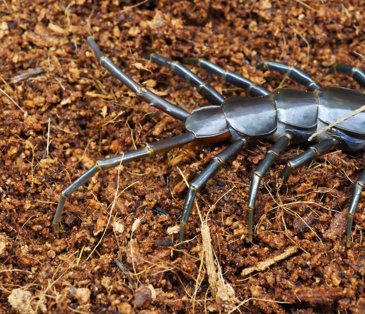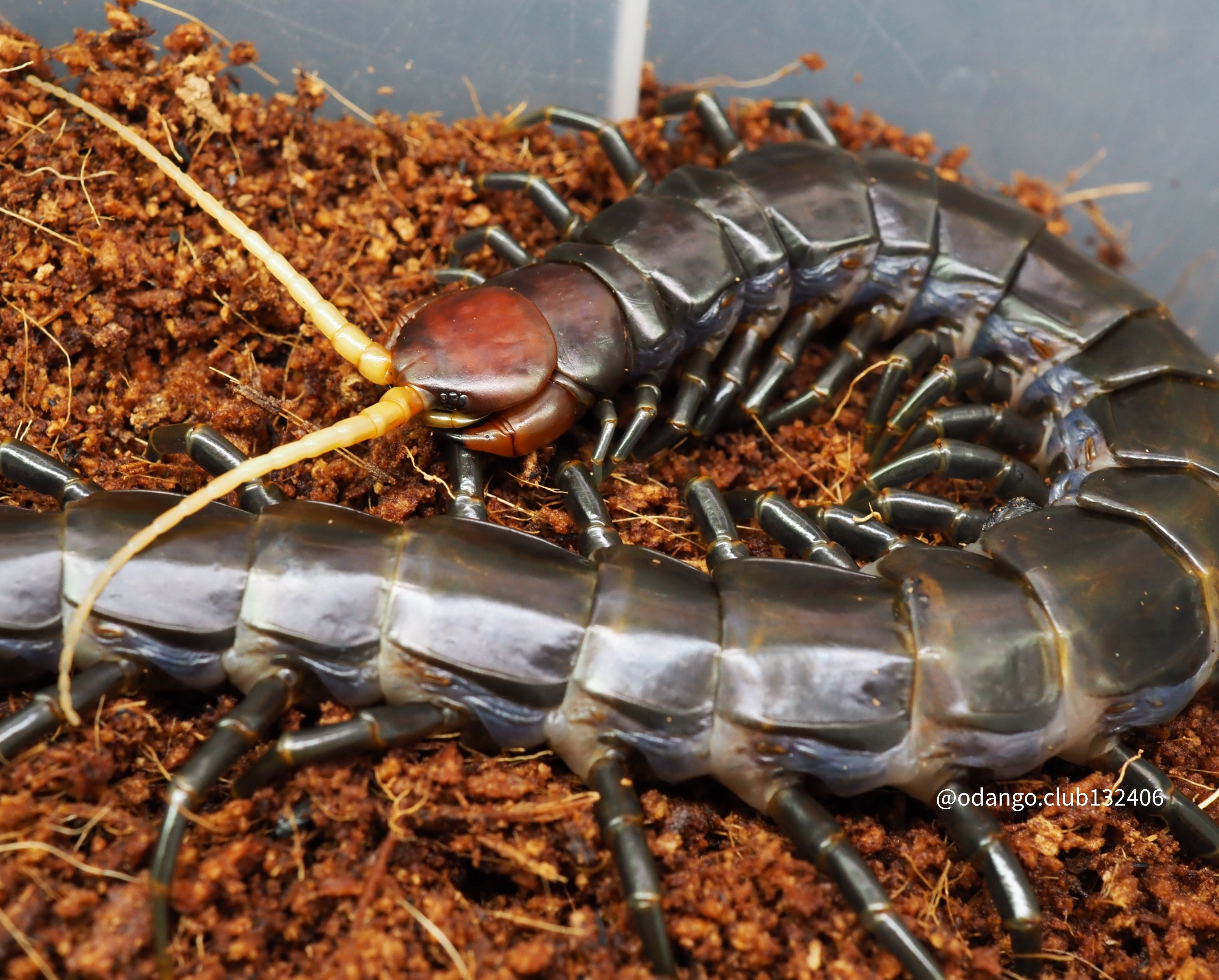 黒色の体に深みのある赤色をした頭が美しいムカデです。