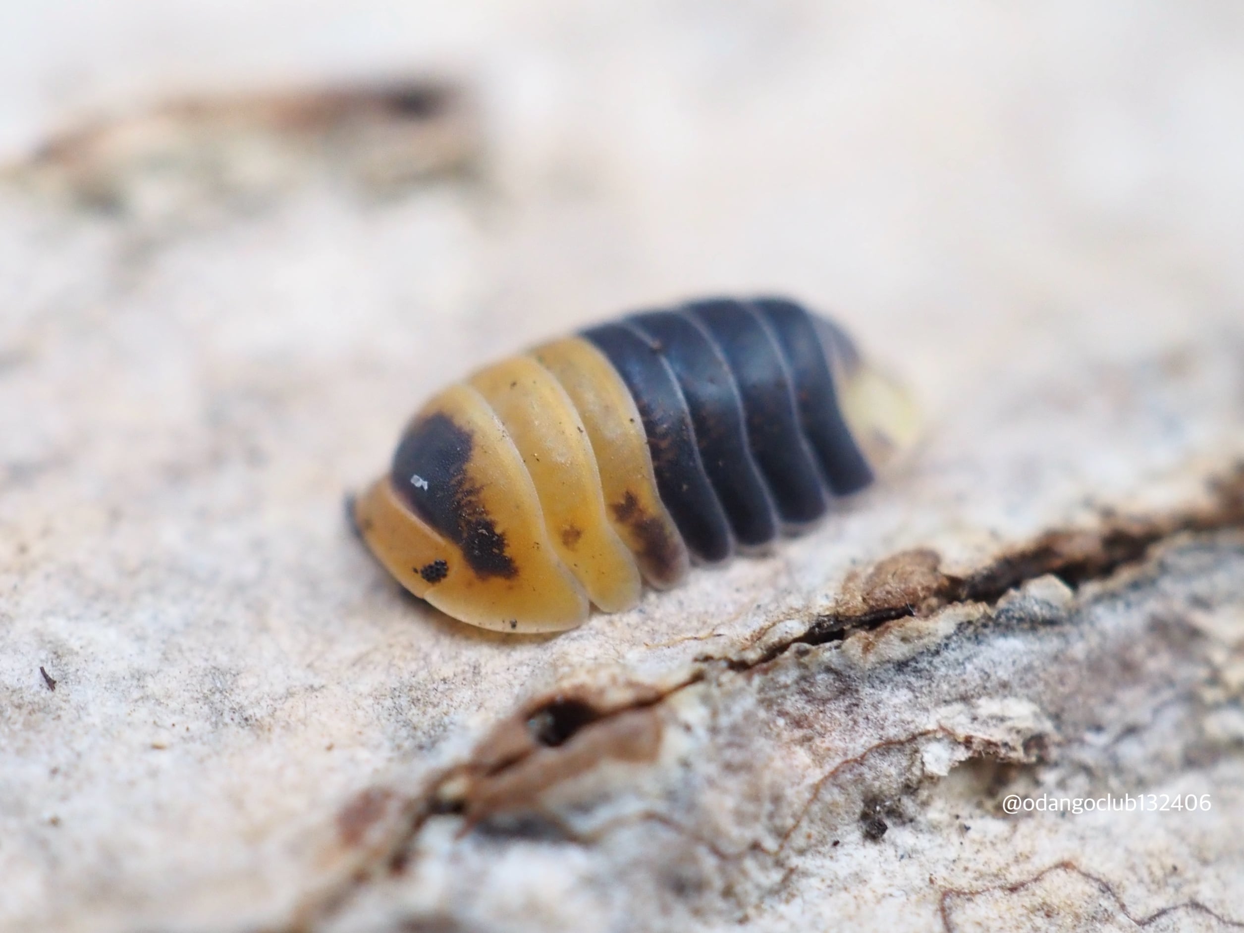 黄色の体に黒の太いバンドが入る綺麗なダンゴムシで、頭部に黒が入り前髪のように見えるところも可愛らしいです。