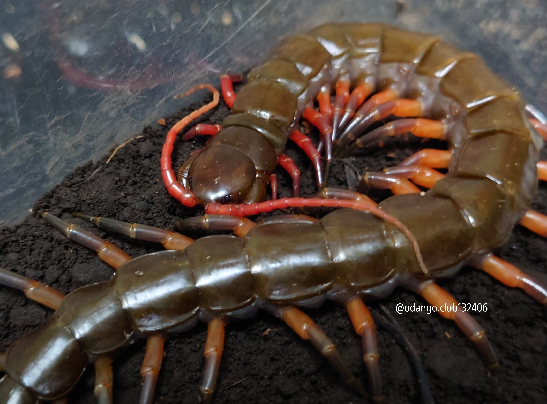 翡翠のような体に赤と青のグラデーションが綺麗な脚が特徴のムカデです。